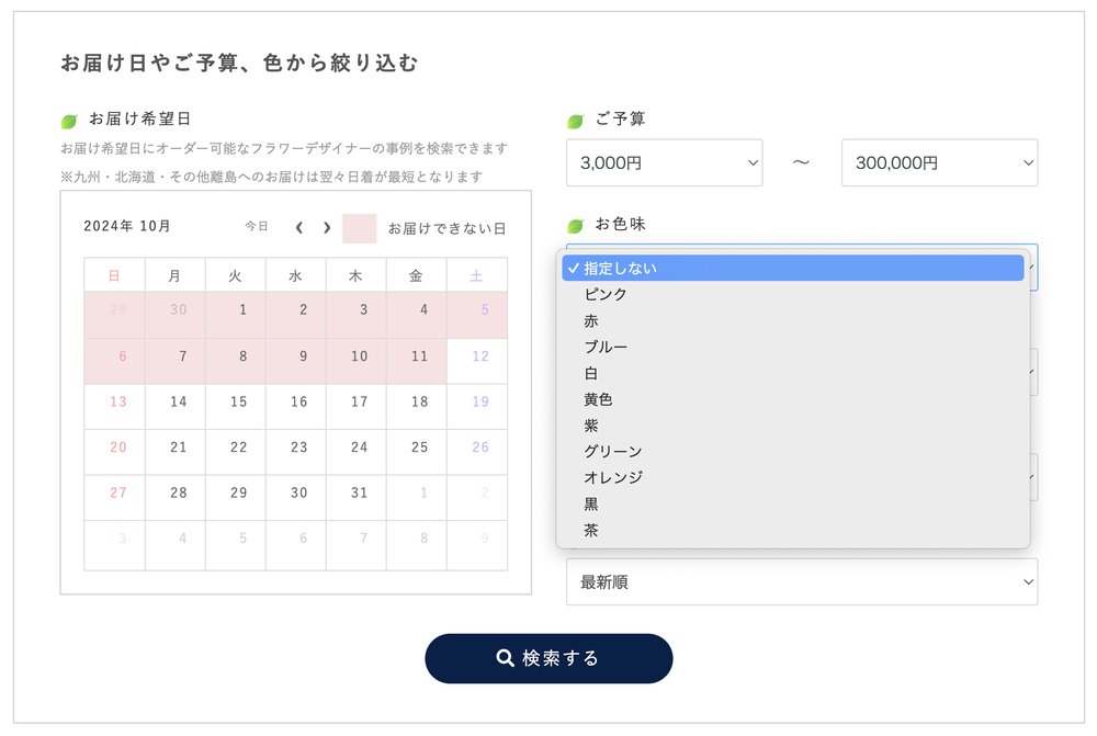 お届け先地域とお届け日時を選択することで、簡単に検索することが可能です🔍