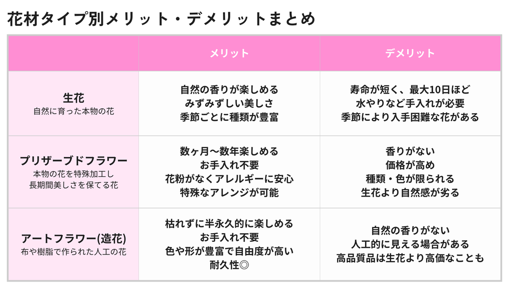 花材は「長持ちさせたい」「自然のお花の美しさを大事にしたい」「特殊なデザインに挑戦してみたい」など、叶えたいイメージによって選ぶのがおすすめです💡
