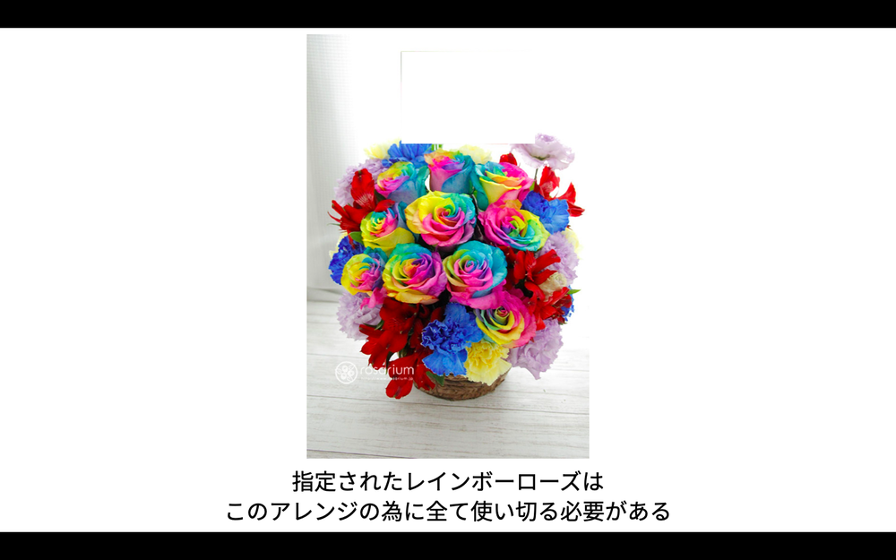 ロスをゼロにする事は、該当のご注文で仕入れたレインボーローズを全て使い切らない限りは難しい状況です。