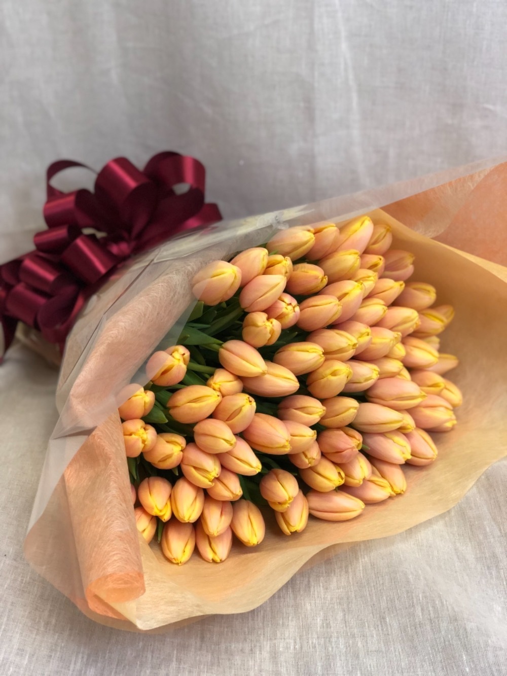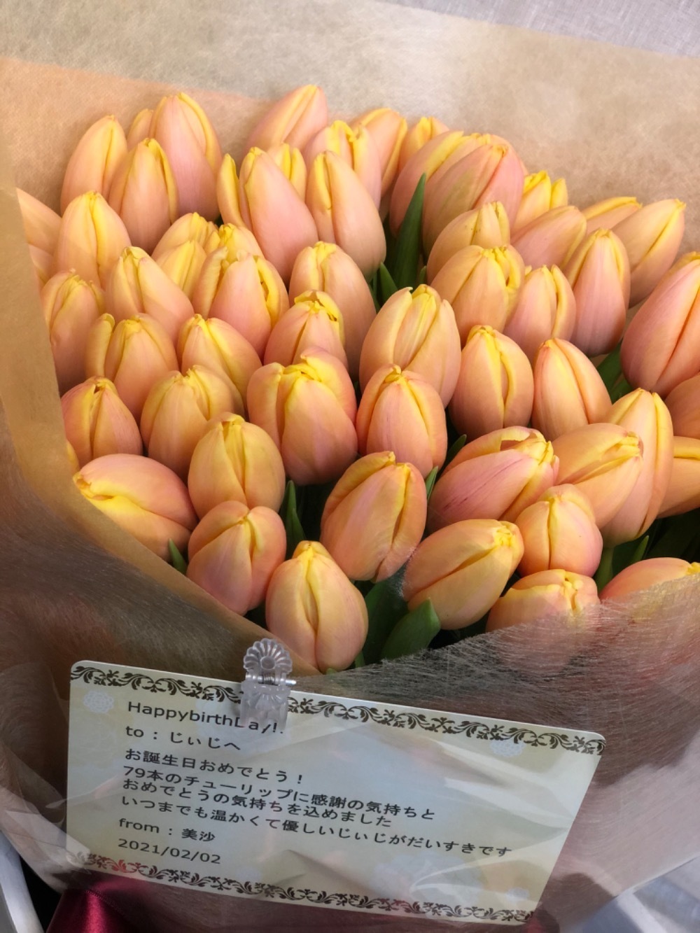 より長く楽しんでもらえるようにとややつぼみ状態での花束で、祖父祖母共に咲くまでの工程を見れて大変喜んでくれました。