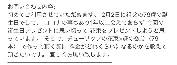 2年前に祖父の79歳の誕生日にお花を贈りたい!と思いお花屋さんを探したのがはじまりです。