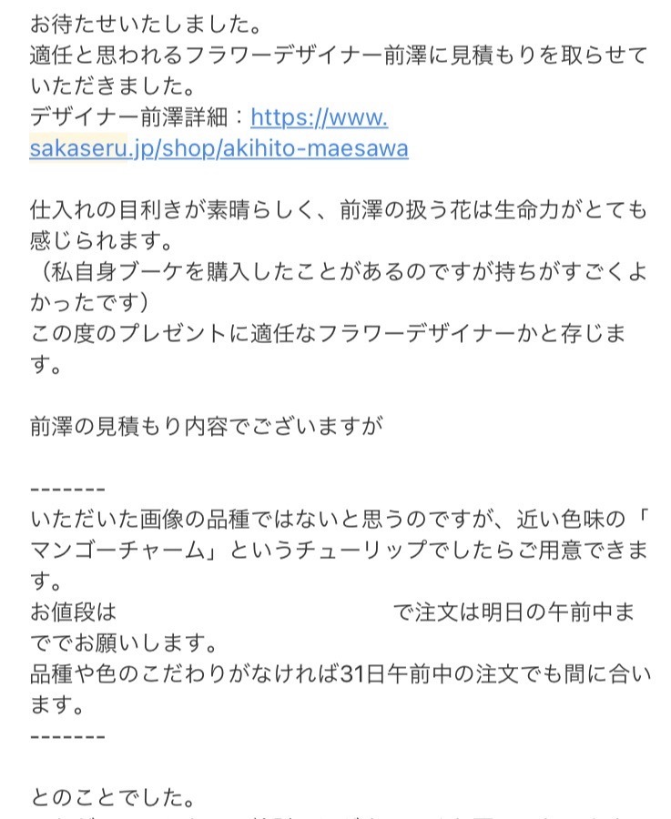 正直花束を注文した際は、小柴さんに完全お任せでしたので、前澤さんか、他2人ほどいる中でご案内されたのかな?と思っていたら
