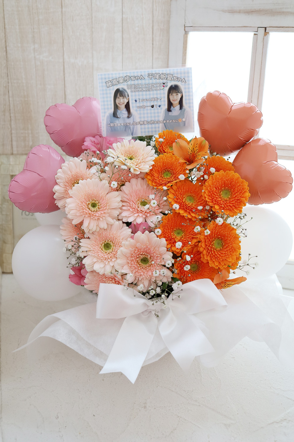 ご出演した藤嶌果歩さん・平尾帆夏さんのお2人に向けて、それぞれのサイリウムカラーのさくらピンクとオレンジをお花とミニバルーンで表現し、かわいい仕上がりに♪