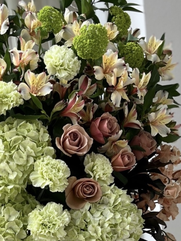 そして、紫陽花、ビバーナム、カーネーション、アルストロメリア、スイートピー、バラなどたくさんの種類を取り入れており、ずっと見ていたくなるフラスタです...♩