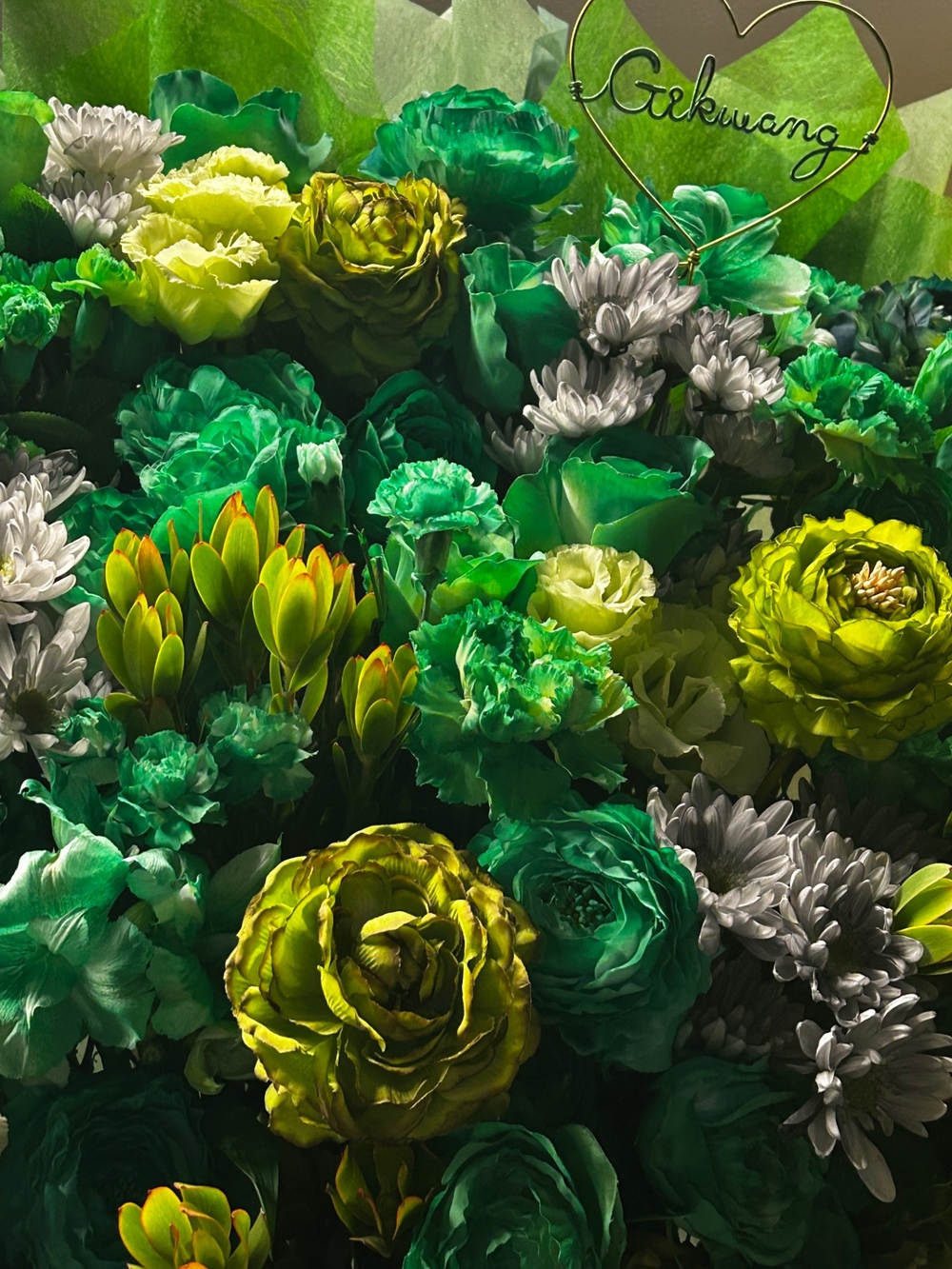今回はライブの最後の曲のMVサムネをイメージして作ってもらったのですが、星をキラキラ光るストーンのピックをご提案頂きより立体的で素敵なお花になりました。