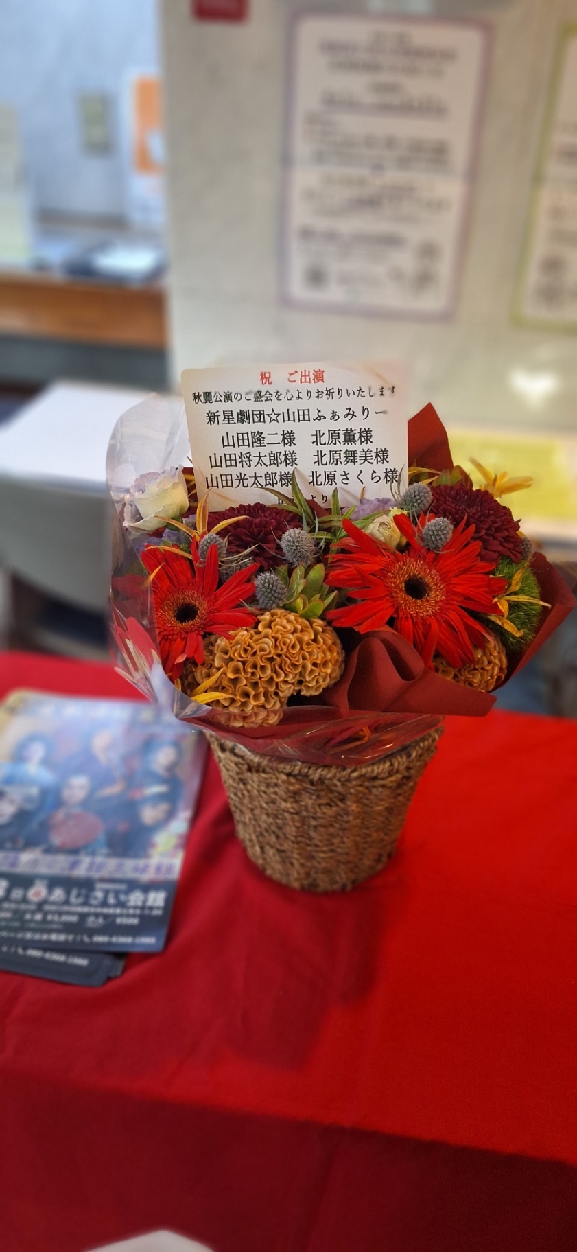 毎回デザイナー前澤章人さんのアレンジメントには感動させられっぱなしですが、今回も例に漏れず印象的なお花を作っていただきました。秋の公演なので秋らしい雰囲気を携えて、さらに公演のポスターに準えて……とリクエストしたところ、このように秋らしくまた華やかで、そして劇団のパフォーマンスが醸し出す力強さも備えたお花に仕上げていただきました。新星劇団のみなさんが気に入ってくださったことはもちろんですがご来場のみなさんにも好評で、今回もお贈りしてよかったなと思いました。