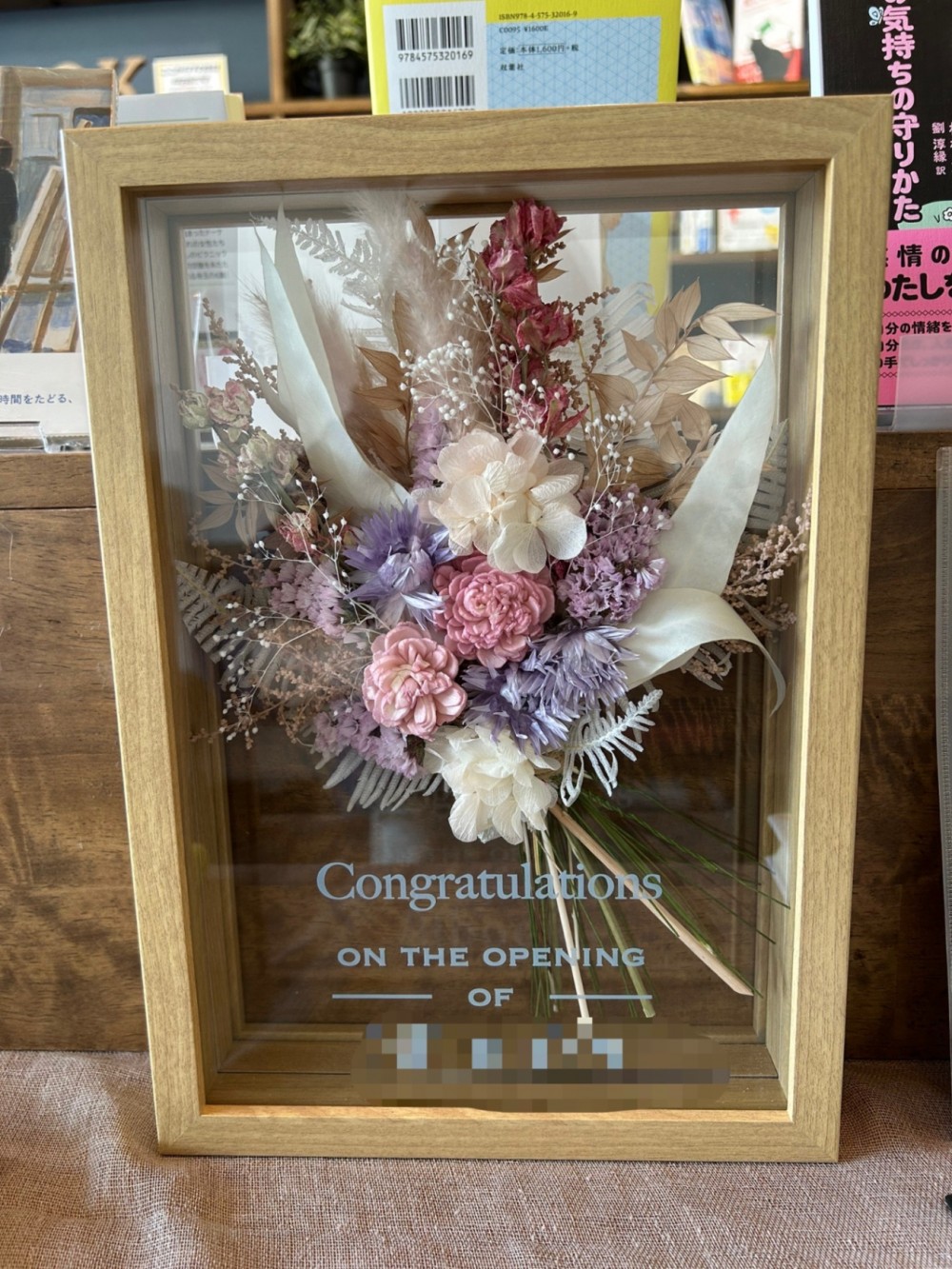 深紅の花を主に希望の白も添えていただきました。barにふさわしい感じに仕上がり、文字の白も引き立ったと思っています。
