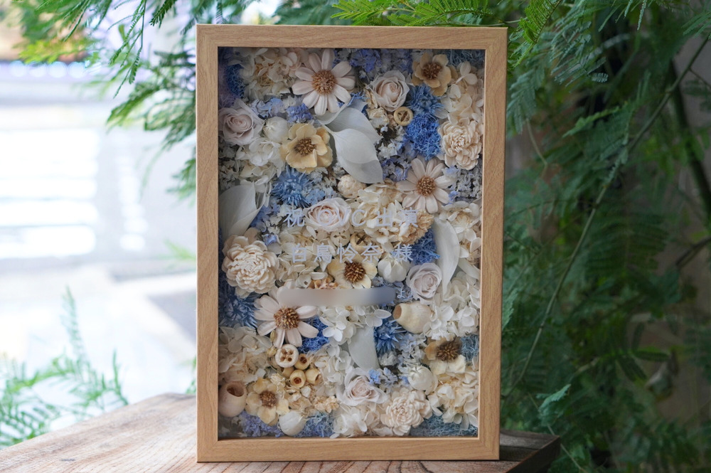 ドライフラワーとプリザーブドフラワーをガラスの中に閉じ込めました。全面がお花の、お花畑のようなWallタイプ。お花の色味は、贈り先様のイメージカラー等ご希望に合わせてお作り可能です。ガラス面には文字入れもできるので、お祝いや記念のギフトにぴったり。届いたら置いて飾るだけなので、お手入れ不要。お忙しい方にも喜ばれるフラワーギフトです。