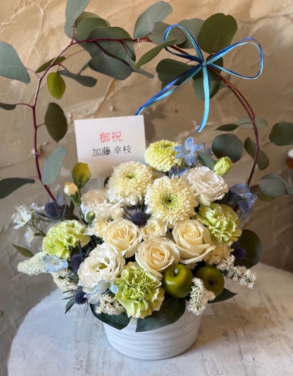 季節によって使用できるお花が異なるため、雰囲気が異なる場合があります。また、フラワーデザイナーが撮影した場所、角度によっても印象が異なることがあります。恐れ入りますが予めご了承ください。