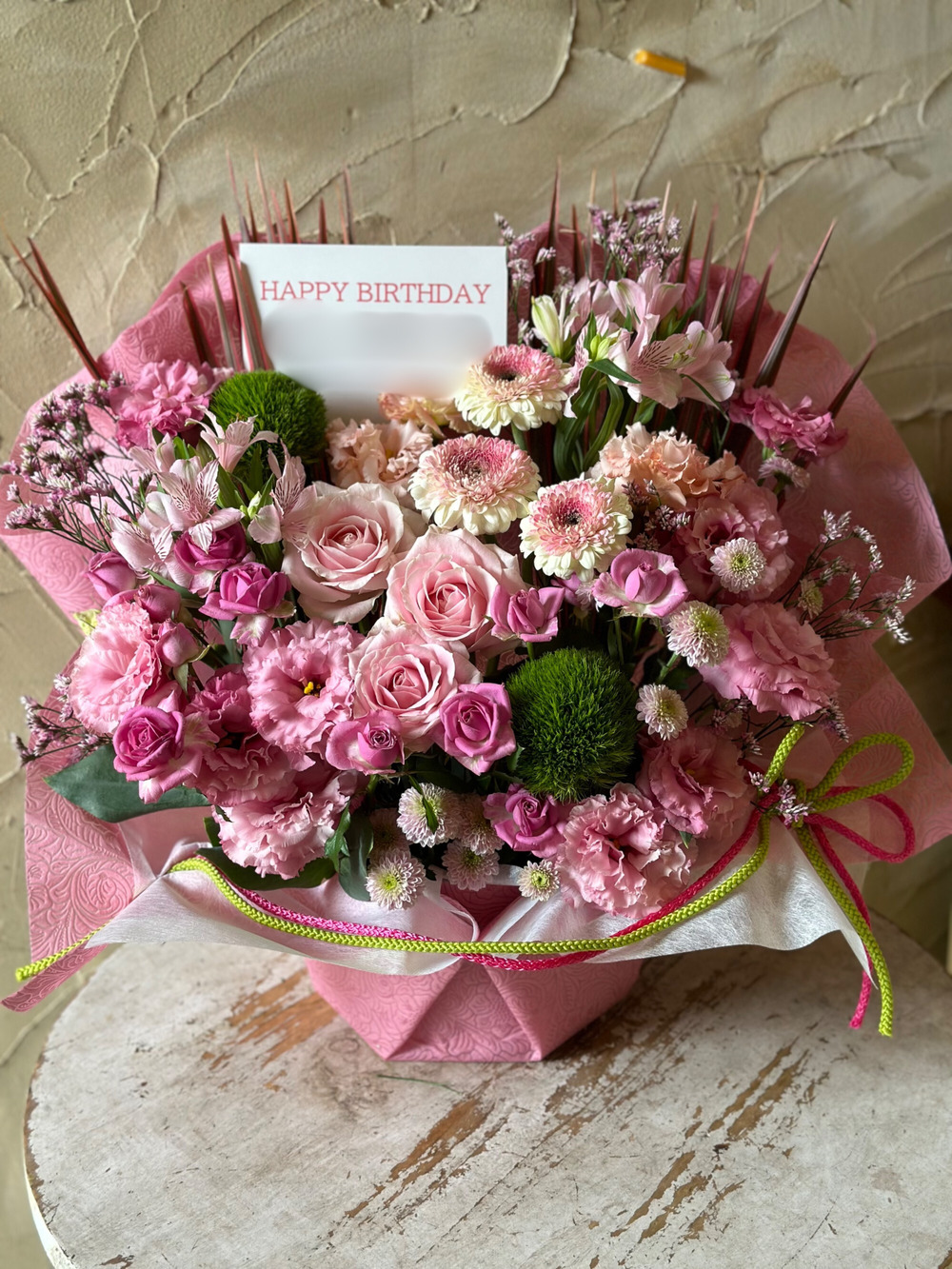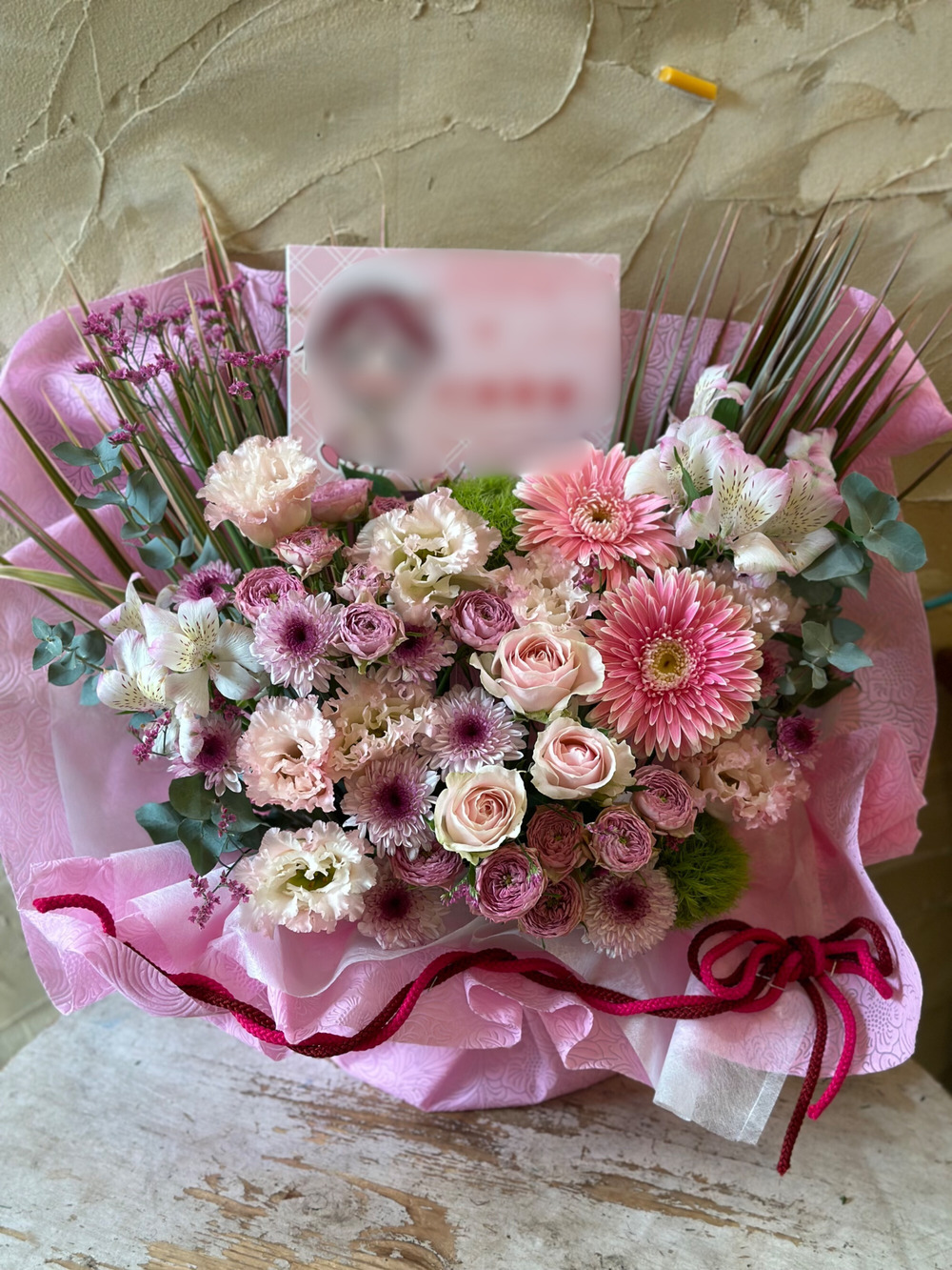 バラやトルコキキョウ、ガーベラなどのピンクの花々をメインにナチュラルにアレンジしました。ラッピング・リボンはお好きな色に変更可能です。送り先さまのイメージカラーに合わせてセレクトください。