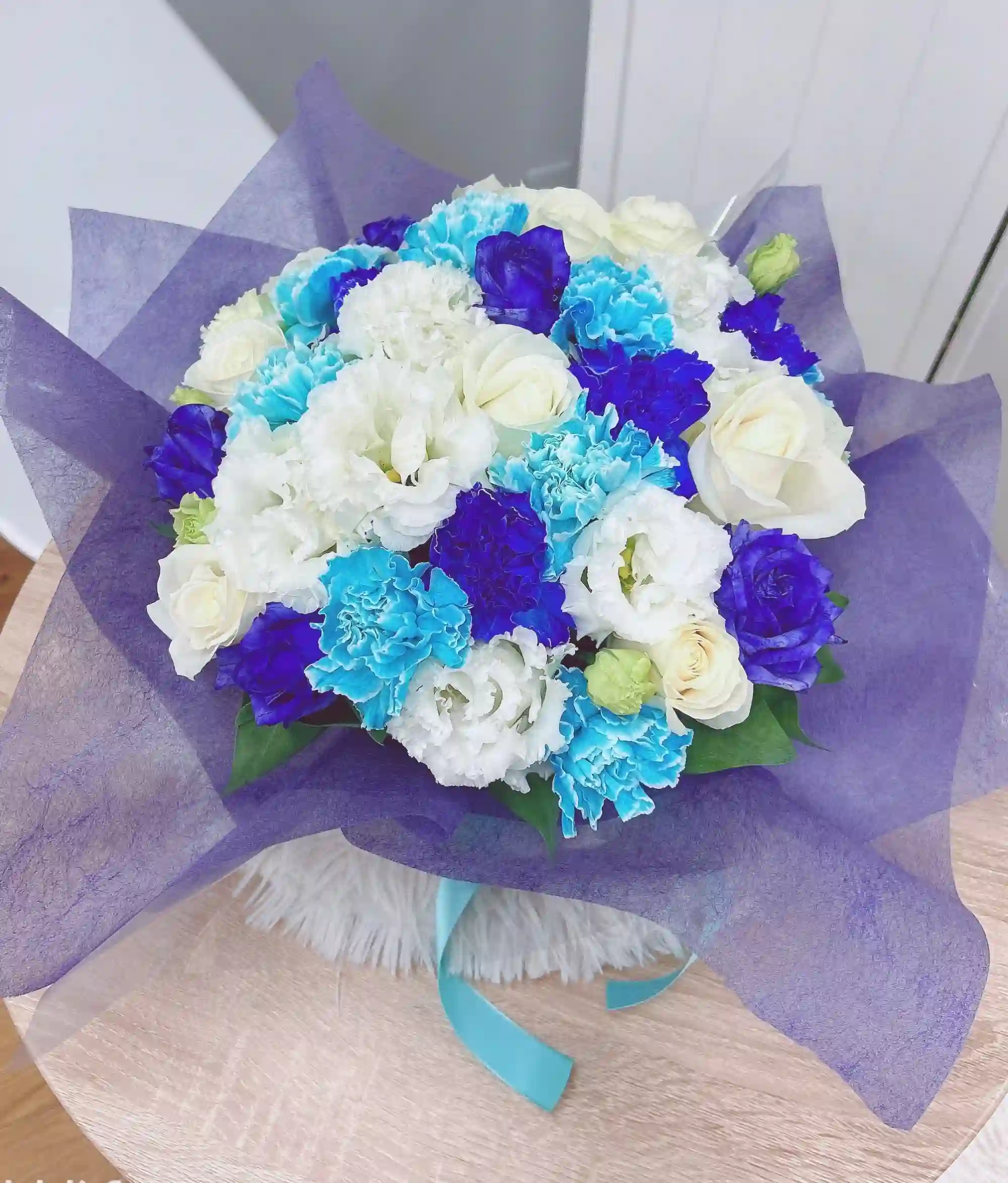 ラッピングが選べるラウンドの生花アレンジ ブルー S