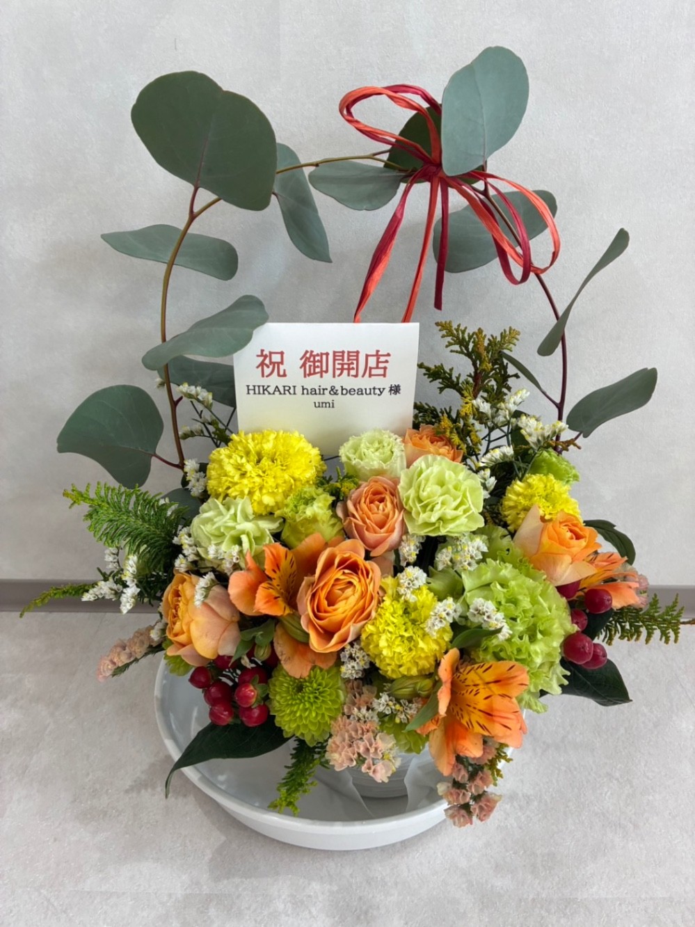 明るいオレンジをメインに、ナチュラルな優しさも感じられるアレンジメントです。これからのご活躍、商売繁盛、幸せな未来への架け橋になるように、そんな想いをアーチに込めてお作りいたします。
