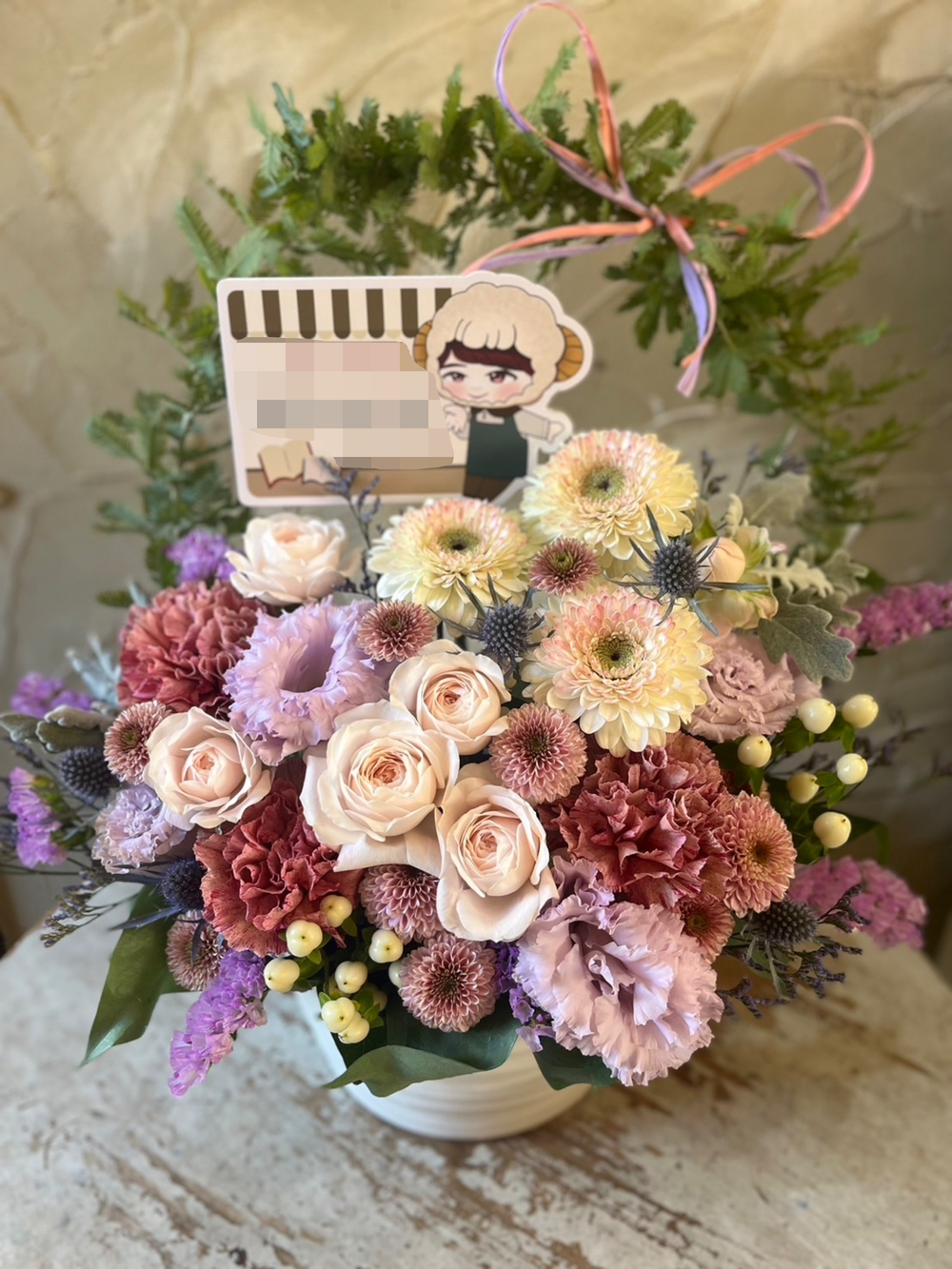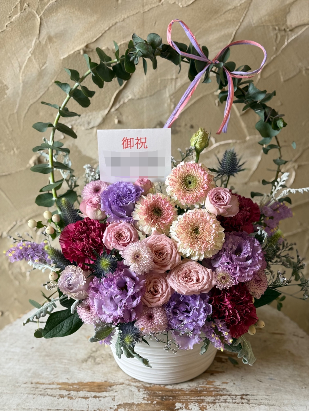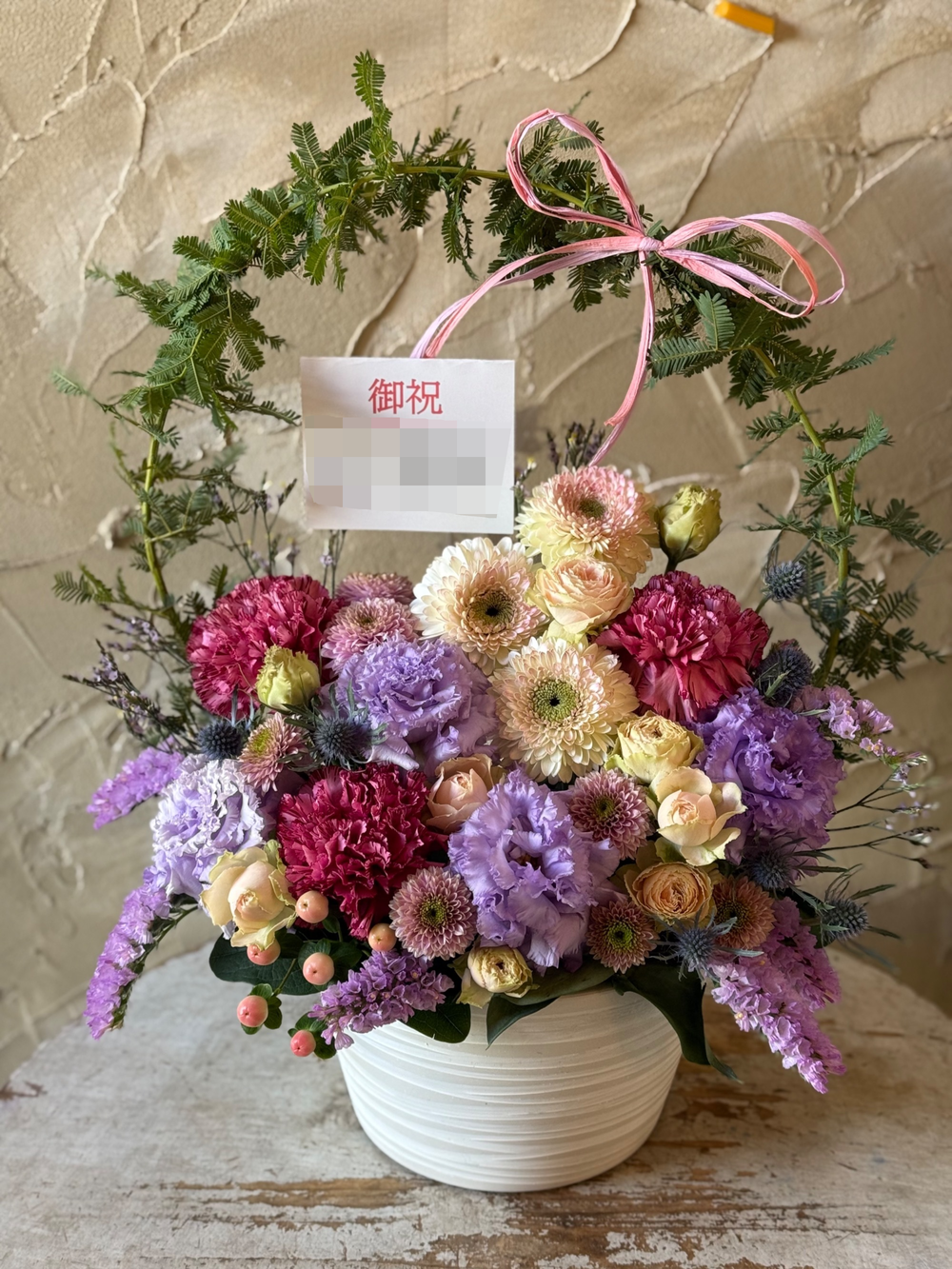 くすみ紫ピンクのニュアンスカラーが大人かわいいアレンジメントです。人気の八重咲ガーベラやバラ、トルコキキョウなどをつめこみました。アーチには、これからのご活躍、商売繁盛、幸せな未来への架け橋になるように、そんな想いを込めてお作りいたします。