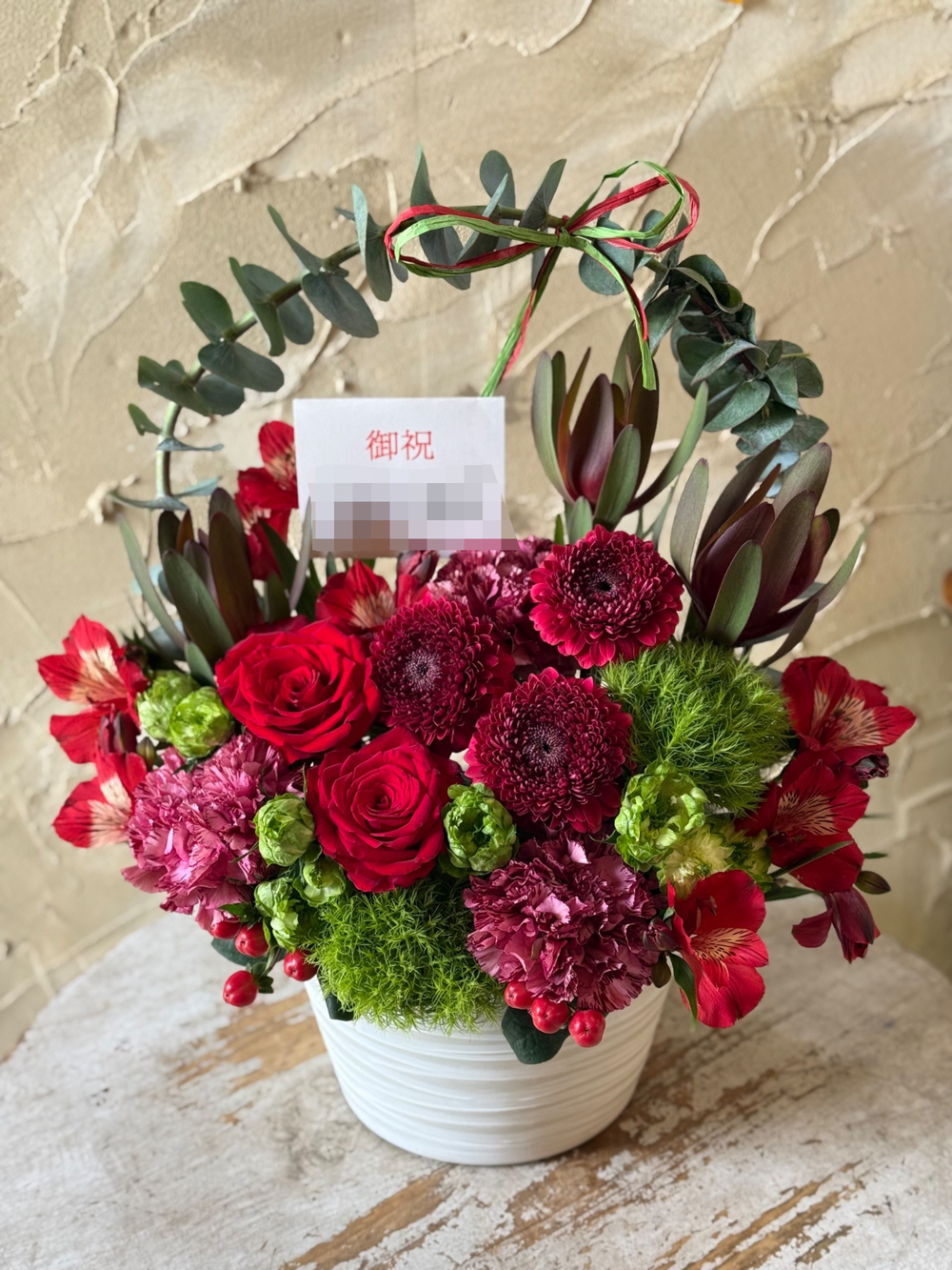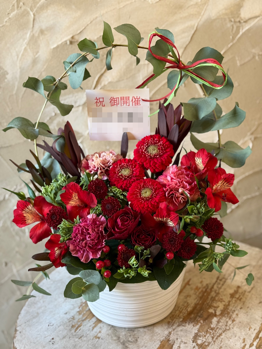バラやガーベラなどの赤い花々をメインにグリーンを合わせ、シックで落ち着いたデザインに仕上げました。これからのご活躍、商売繁盛、幸せな未来への架け橋になるように、そんな想いをアーチに込めてお作りいたします。