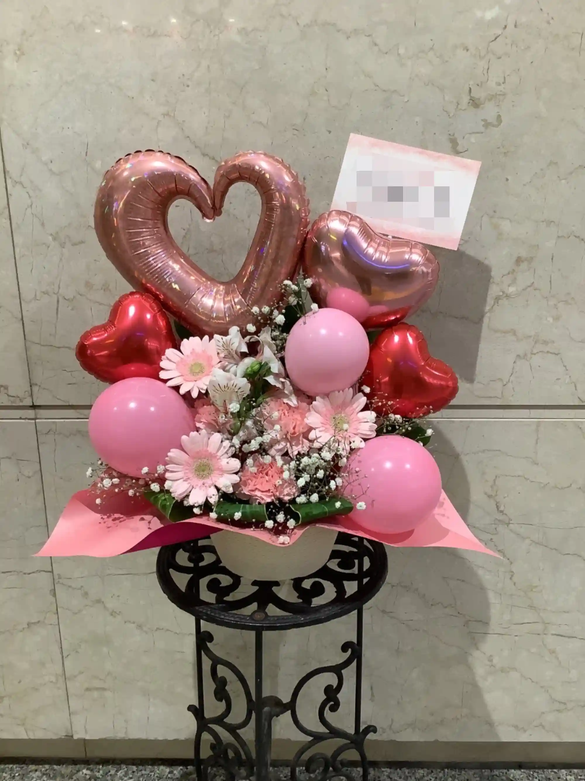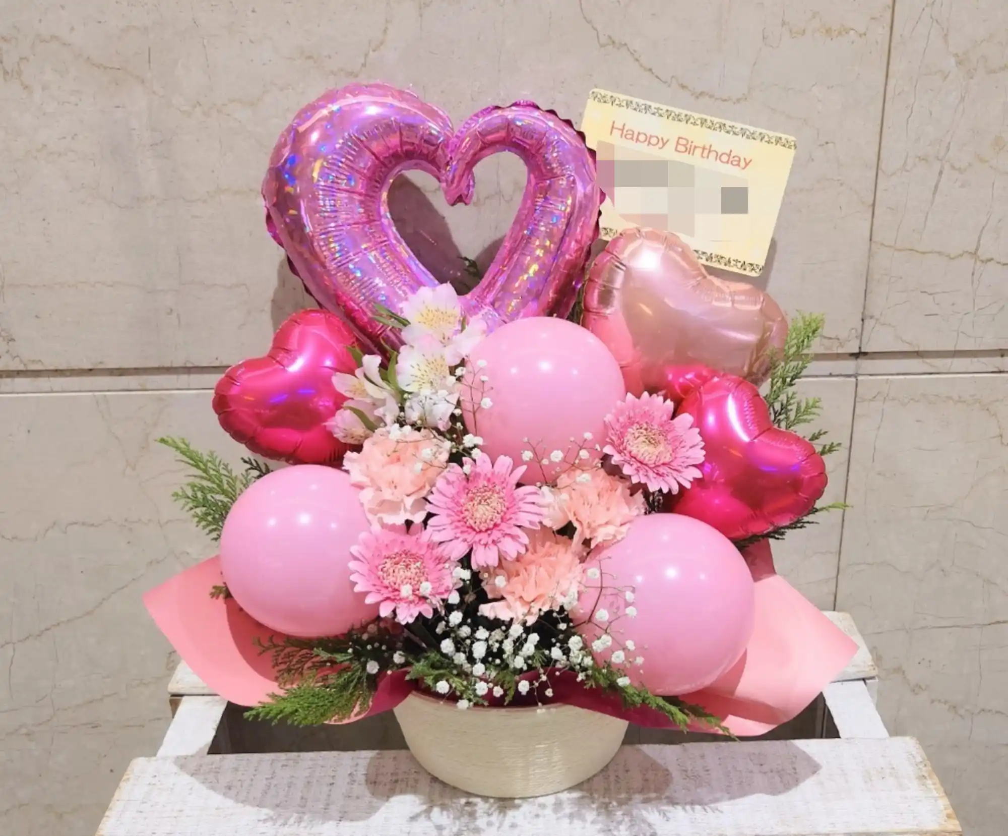 ハートのバルーンが可愛い生花のアレンジメント。目立つアレンジをお届けしたい方、ポップなお祝い花をお探しの方におすすめです。