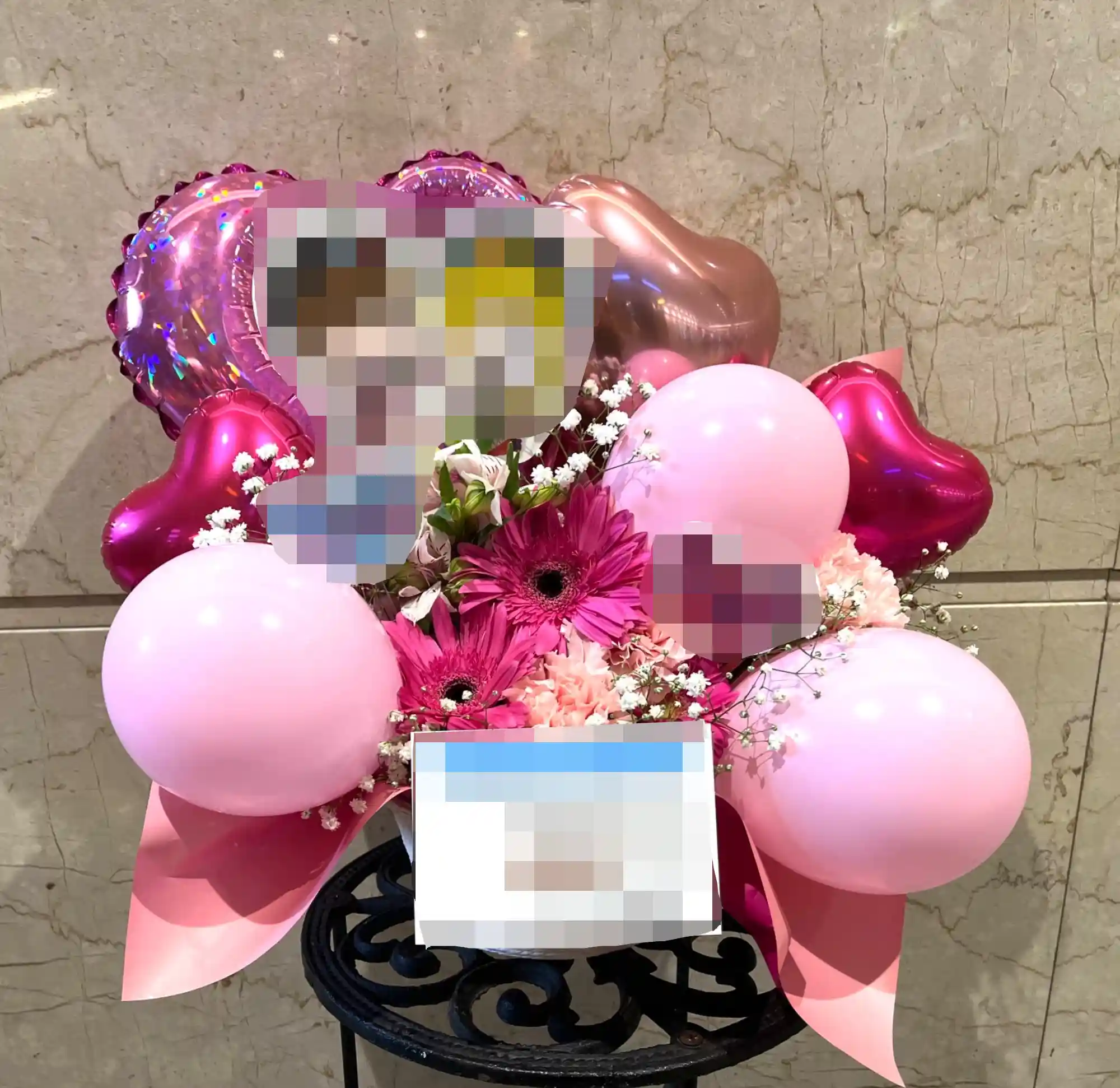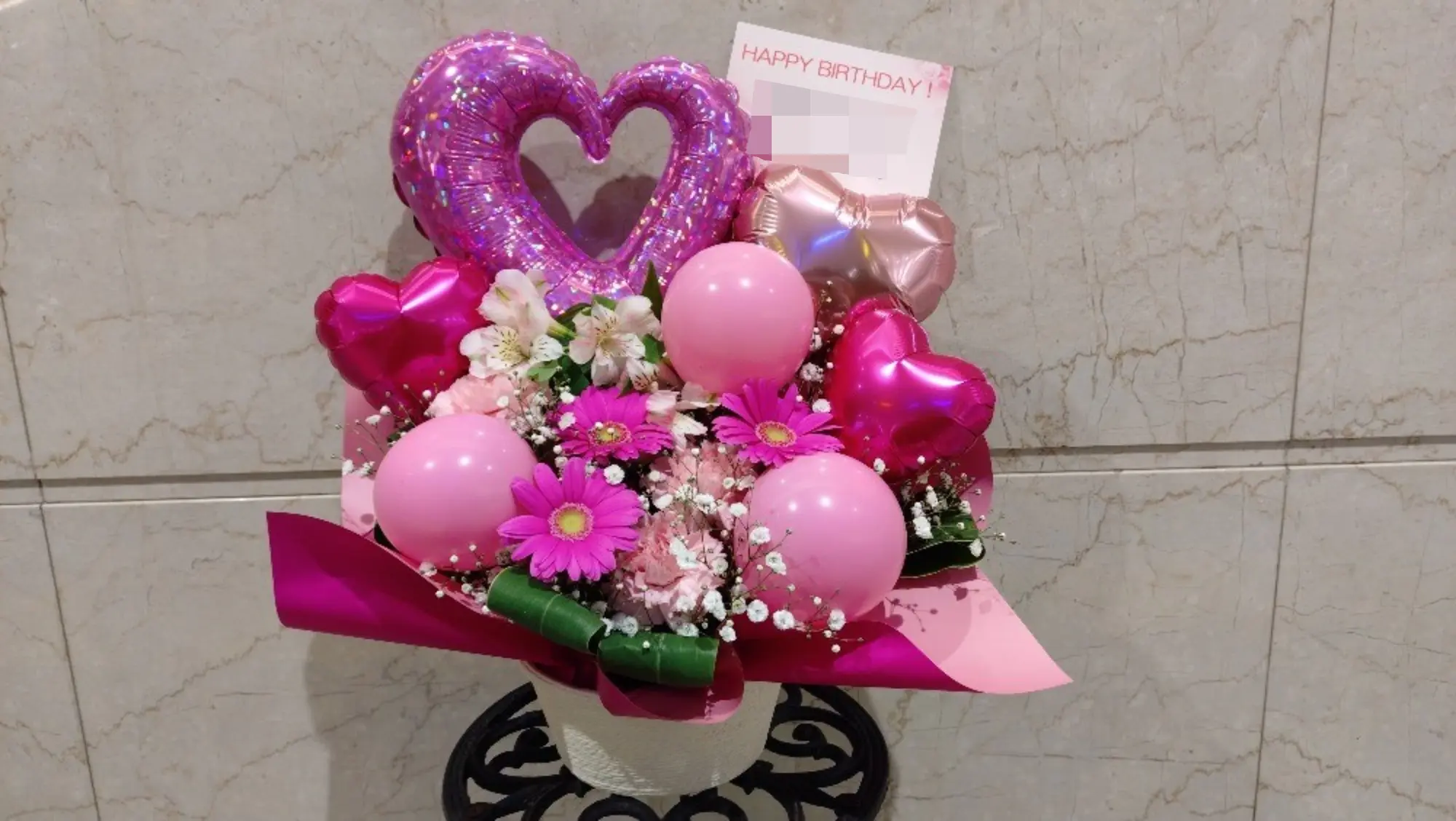 見本を見てとても可愛いと思って注文しました。実物も華やかで、バルーンも花も色がとても綺麗でした。札も可愛く作っていただいて、お誕生日のお祝いにぴったりでした。