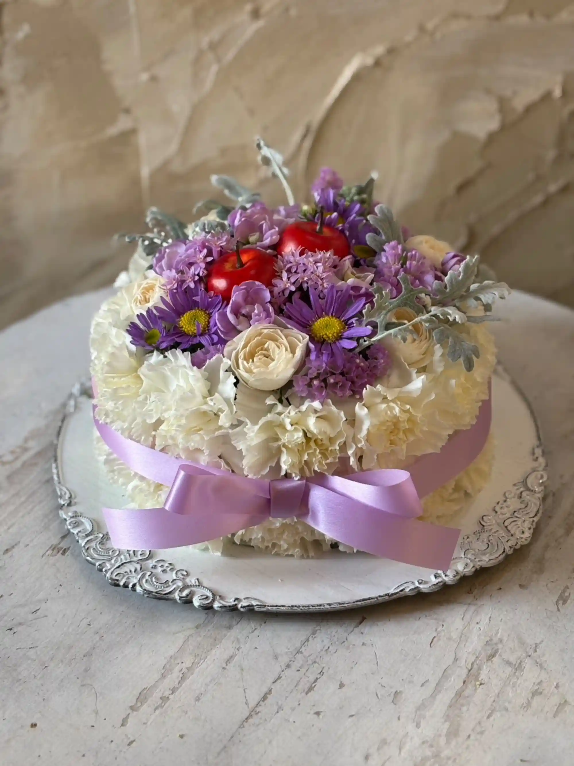 華やかで上品な生花のフラワーケーキ。ふわふわのカーネーションをクリームに見立てて可愛らしくおまとめしました。トッピング・リボンのお色味はお好きな色をご指定いただけます。お誕生日の贈りものや、生誕祭の撮影にぴったりの商品です。 ※ケーキの直径は20cmとなります。