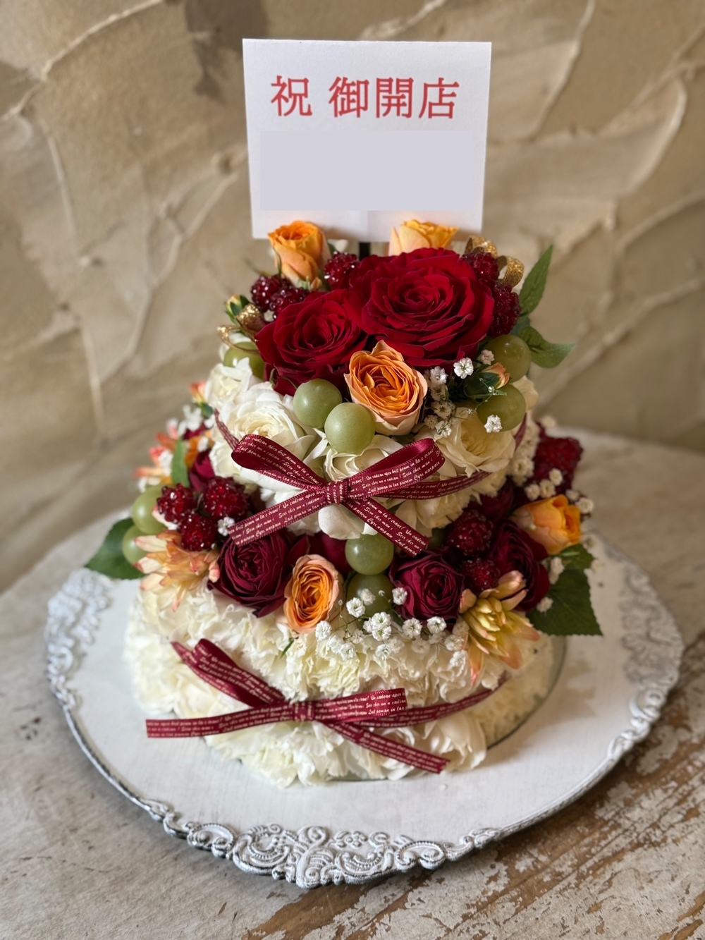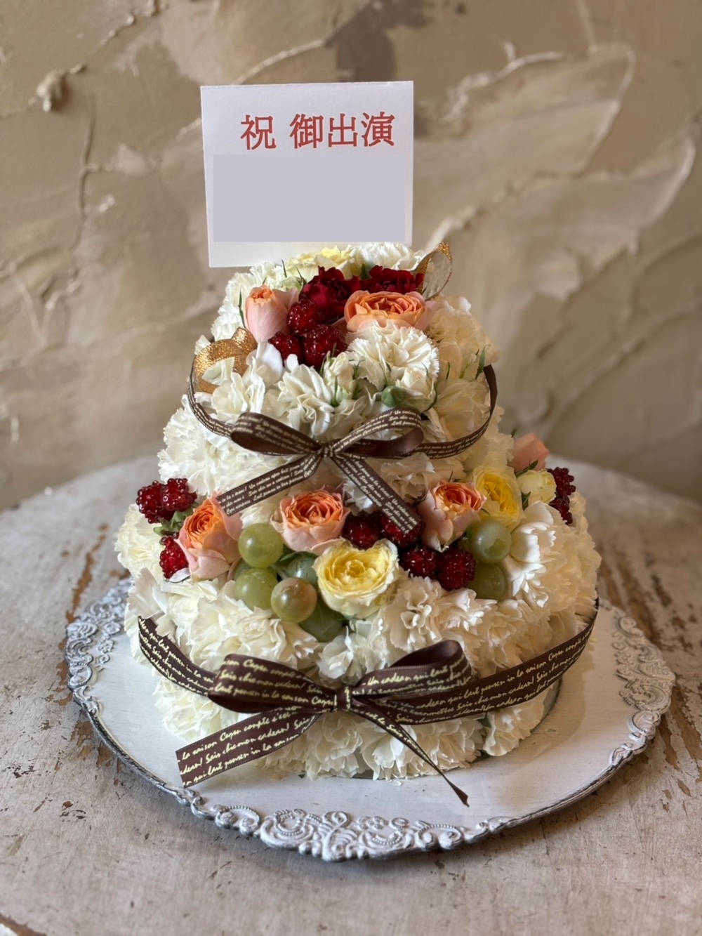 華やかで上品な生花のフラワーケーキ。ふわふわのカーネーションをクリームに見立てて可愛らしくおまとめしました。トッピング・リボンのお色味はお好きな色をご指定いただけます。お誕生日の贈りものや、生誕祭の撮影にぴったりの商品です。 ※ケーキの直径は22cmとなります。