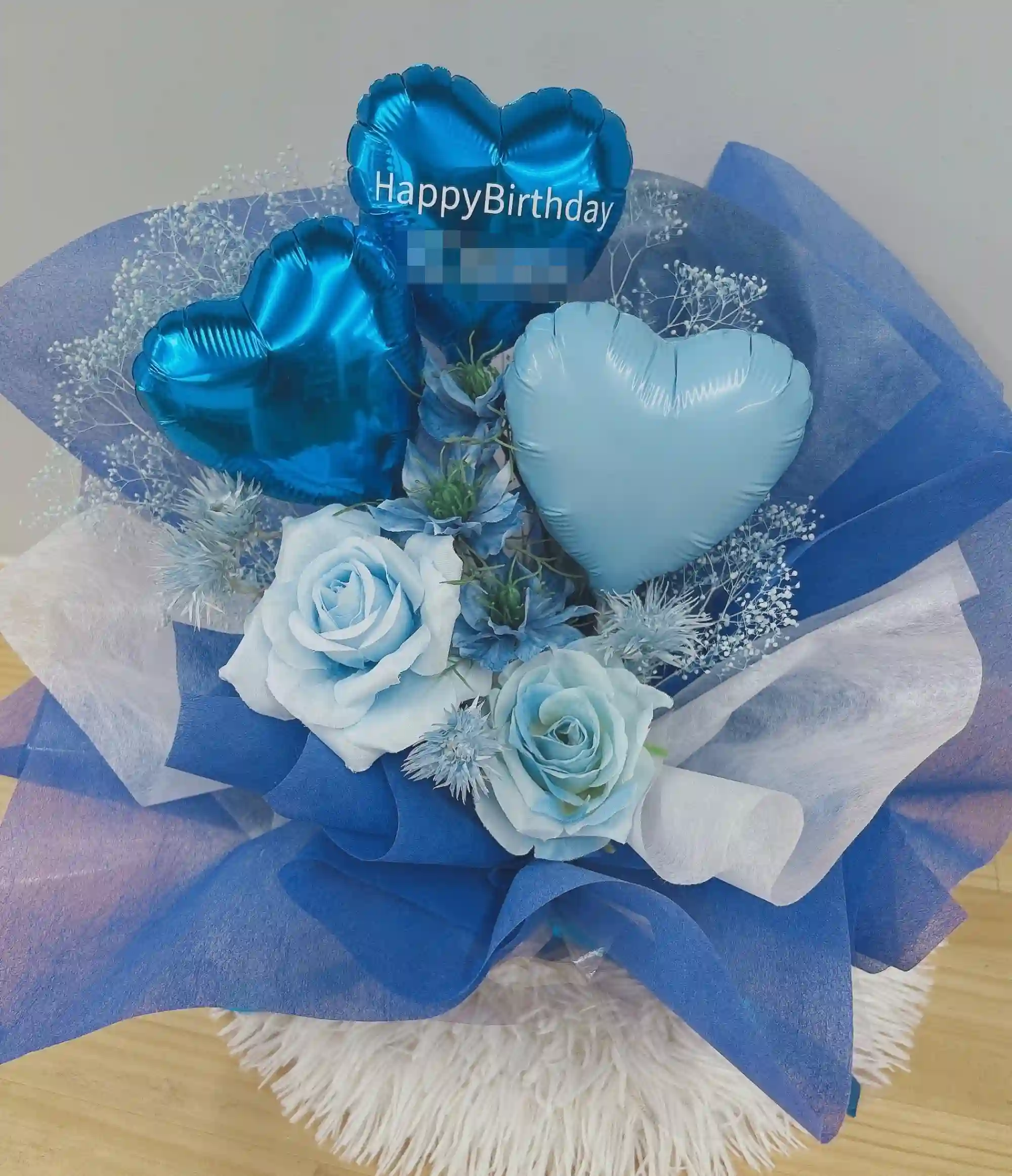 文字入れできる 気球バルーンとアートフラワーのアレンジ ブルー