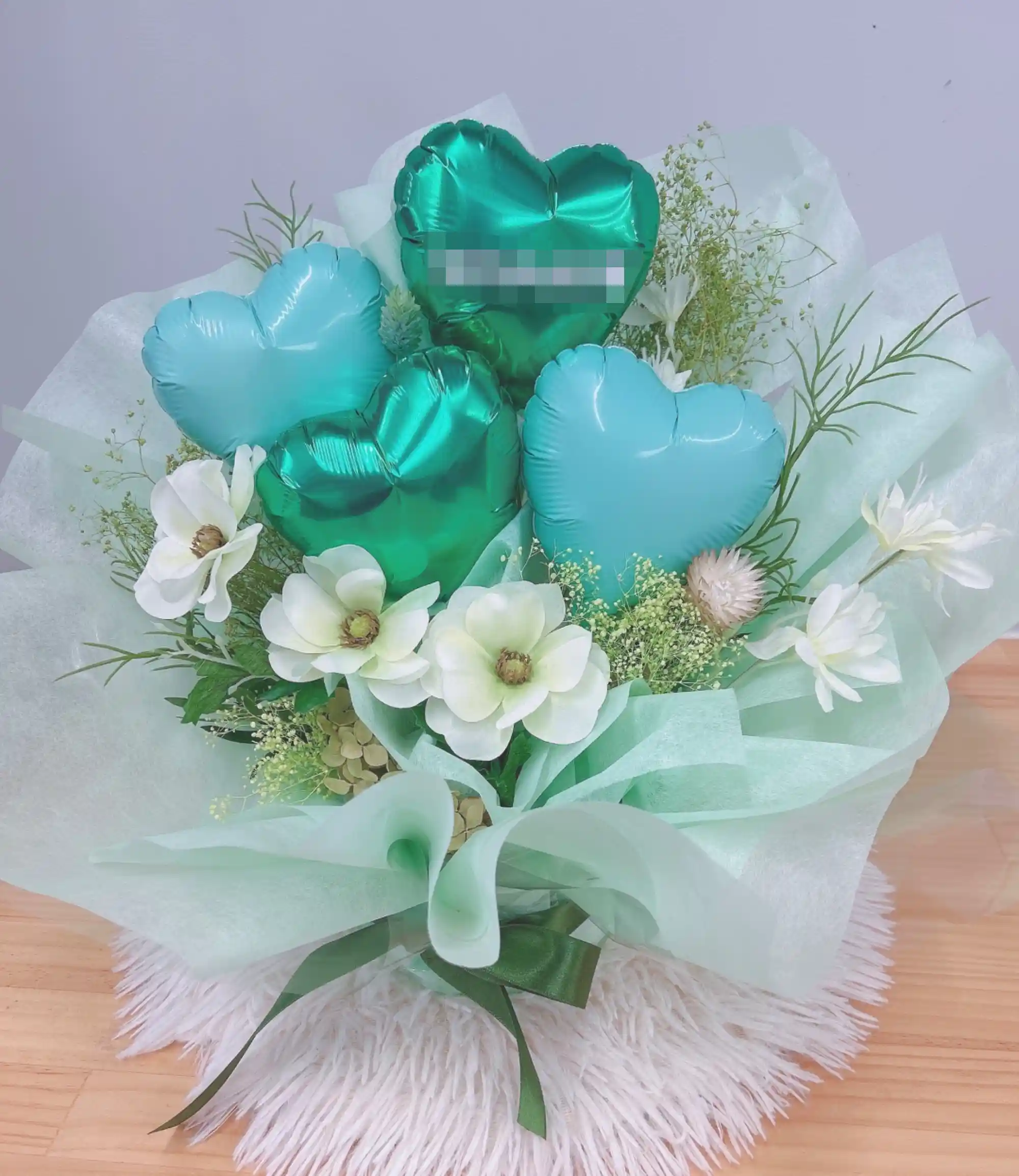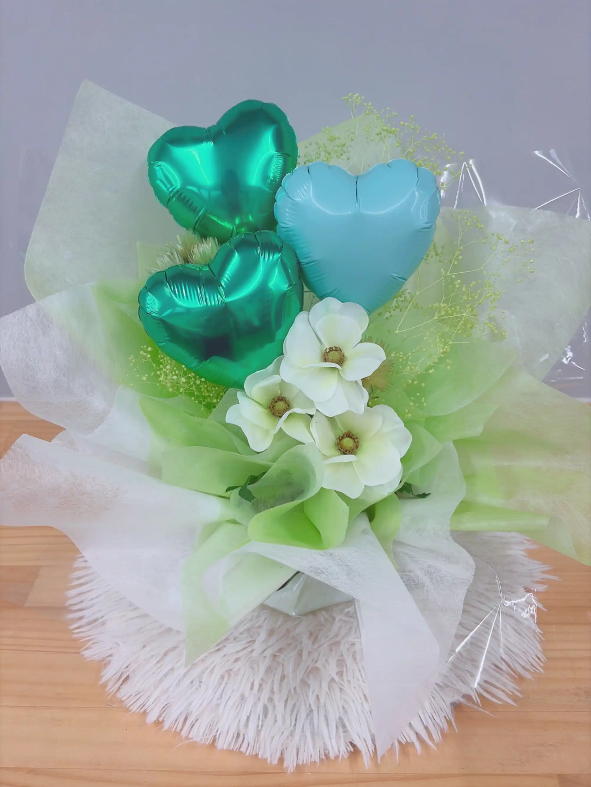 ハートバルーンの生花アレンジ ブルー