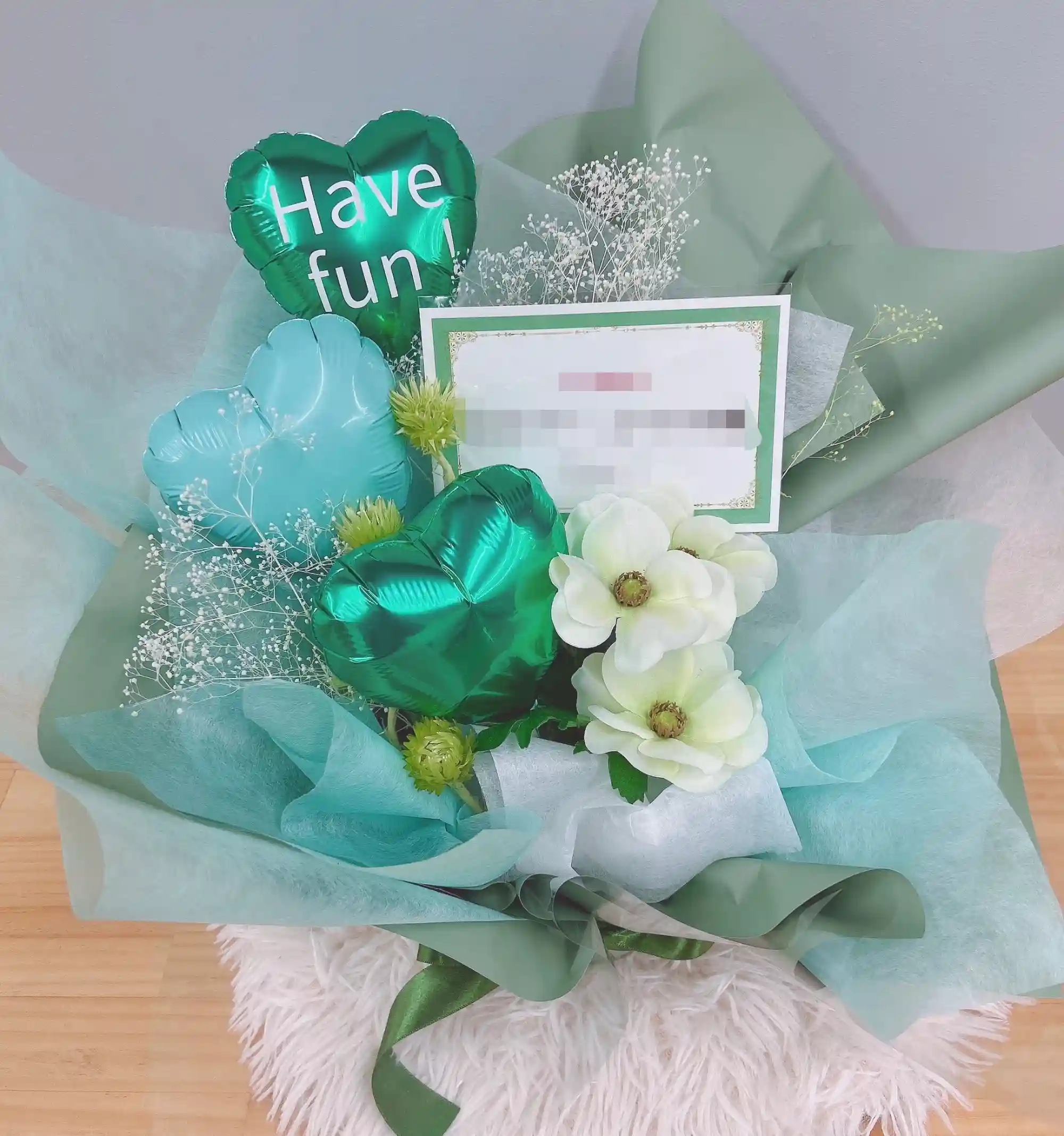 文字入れできる 気球バルーンとアートフラワーのアレンジ 白