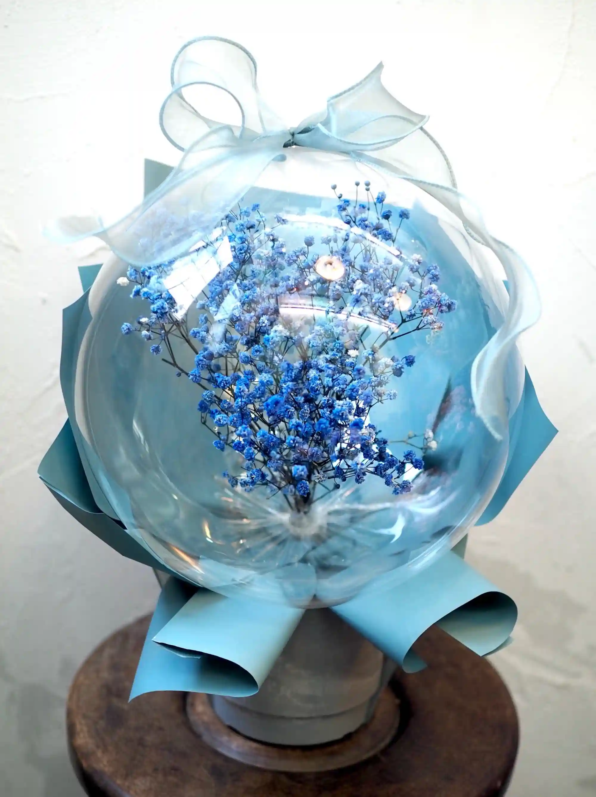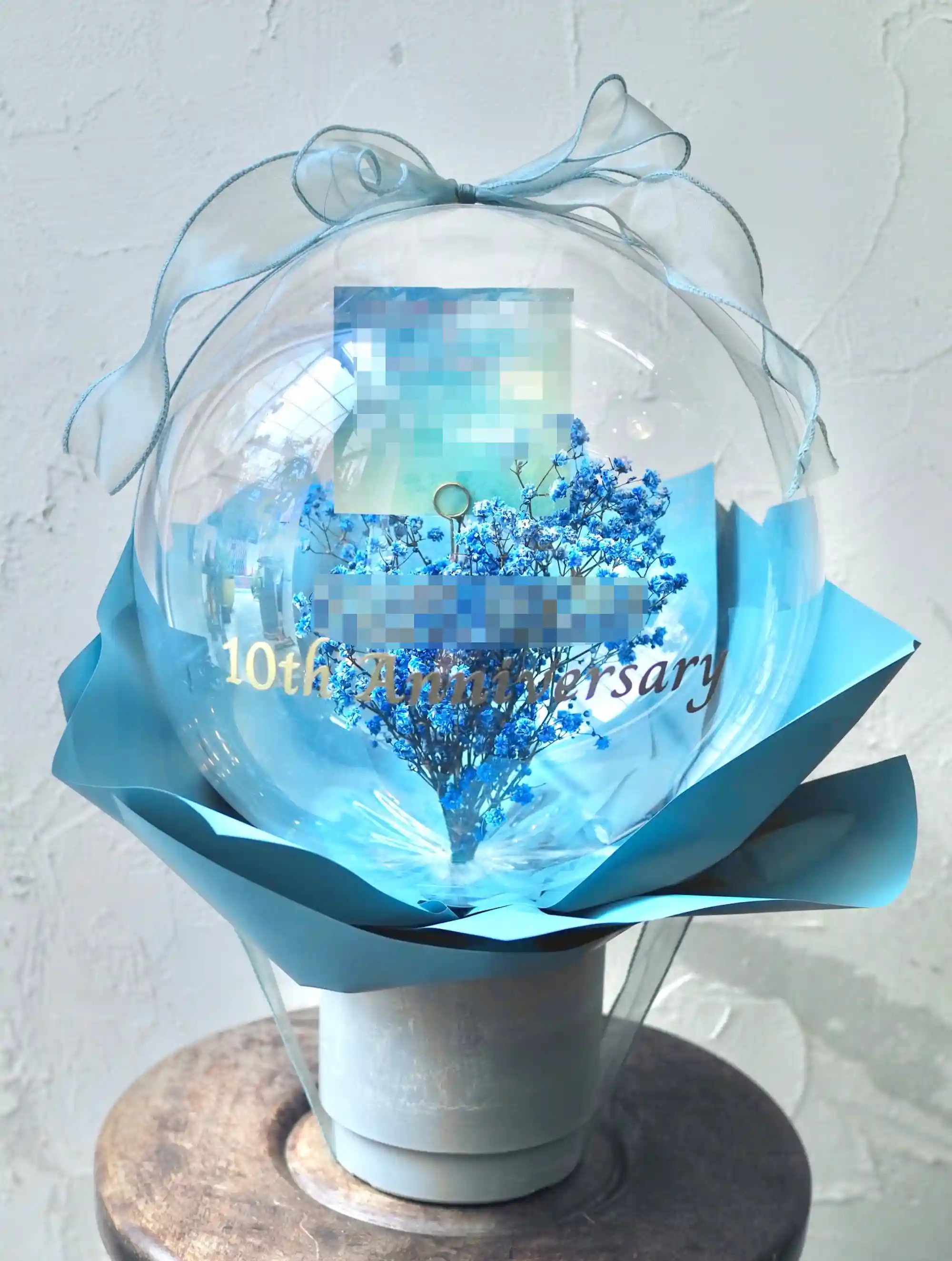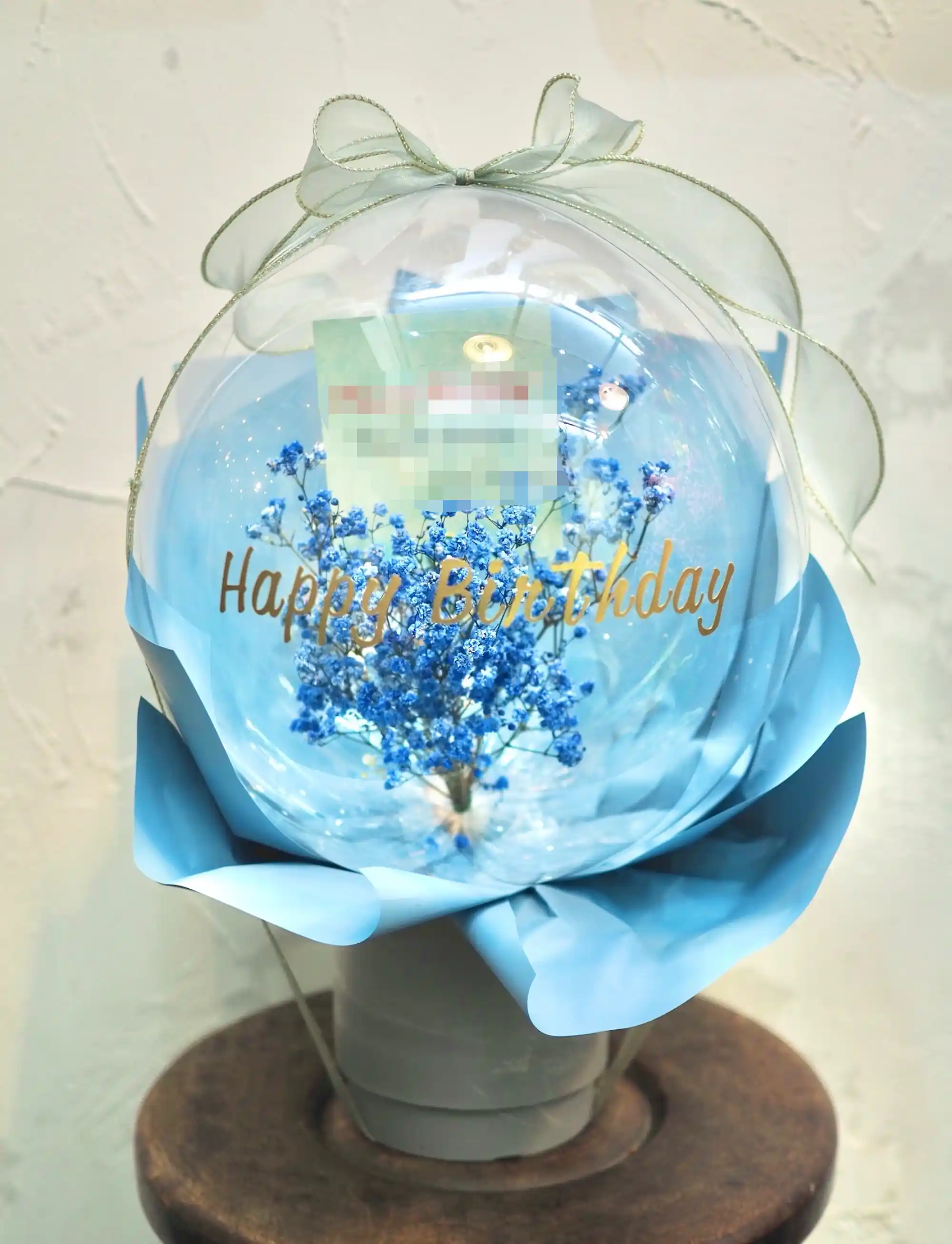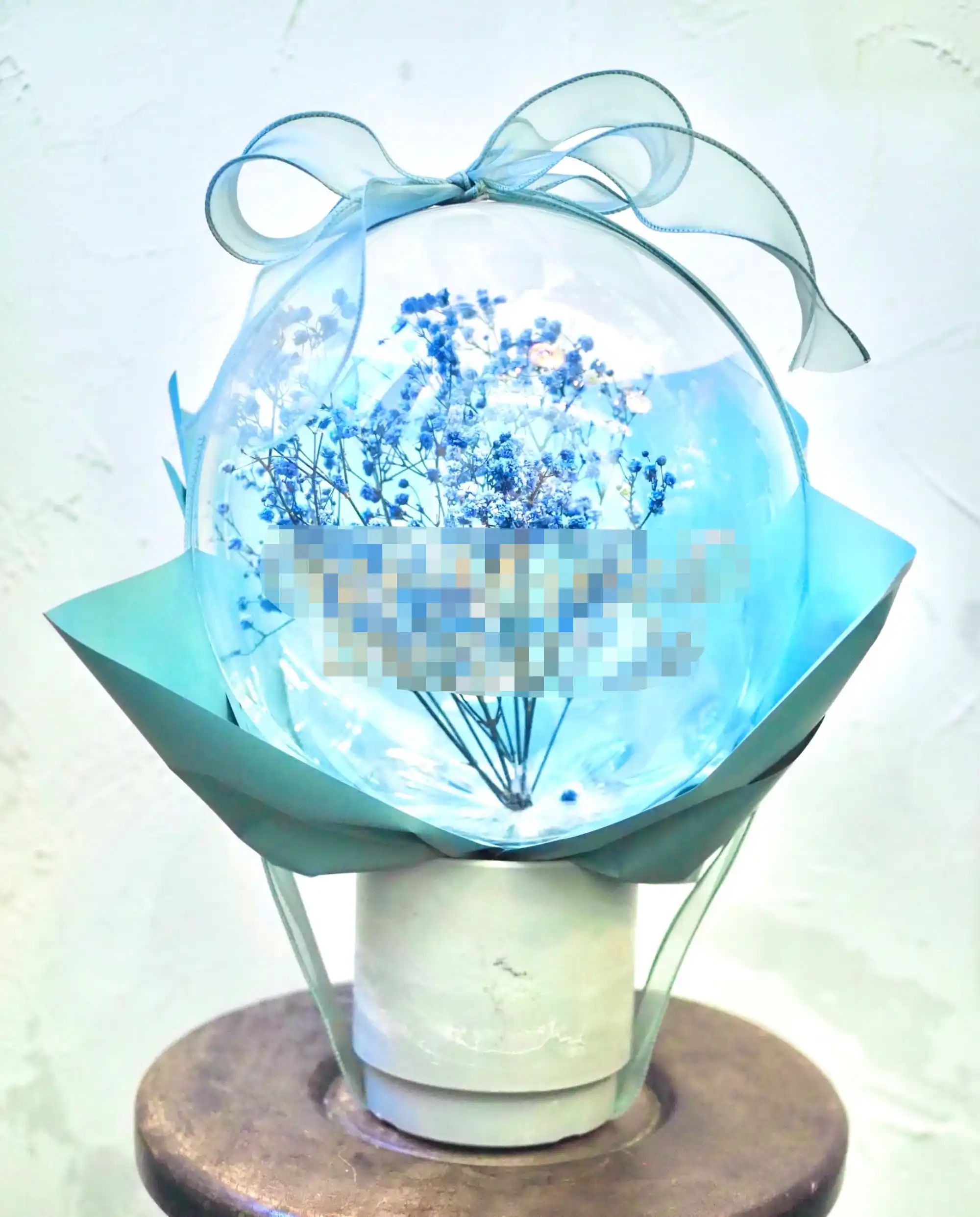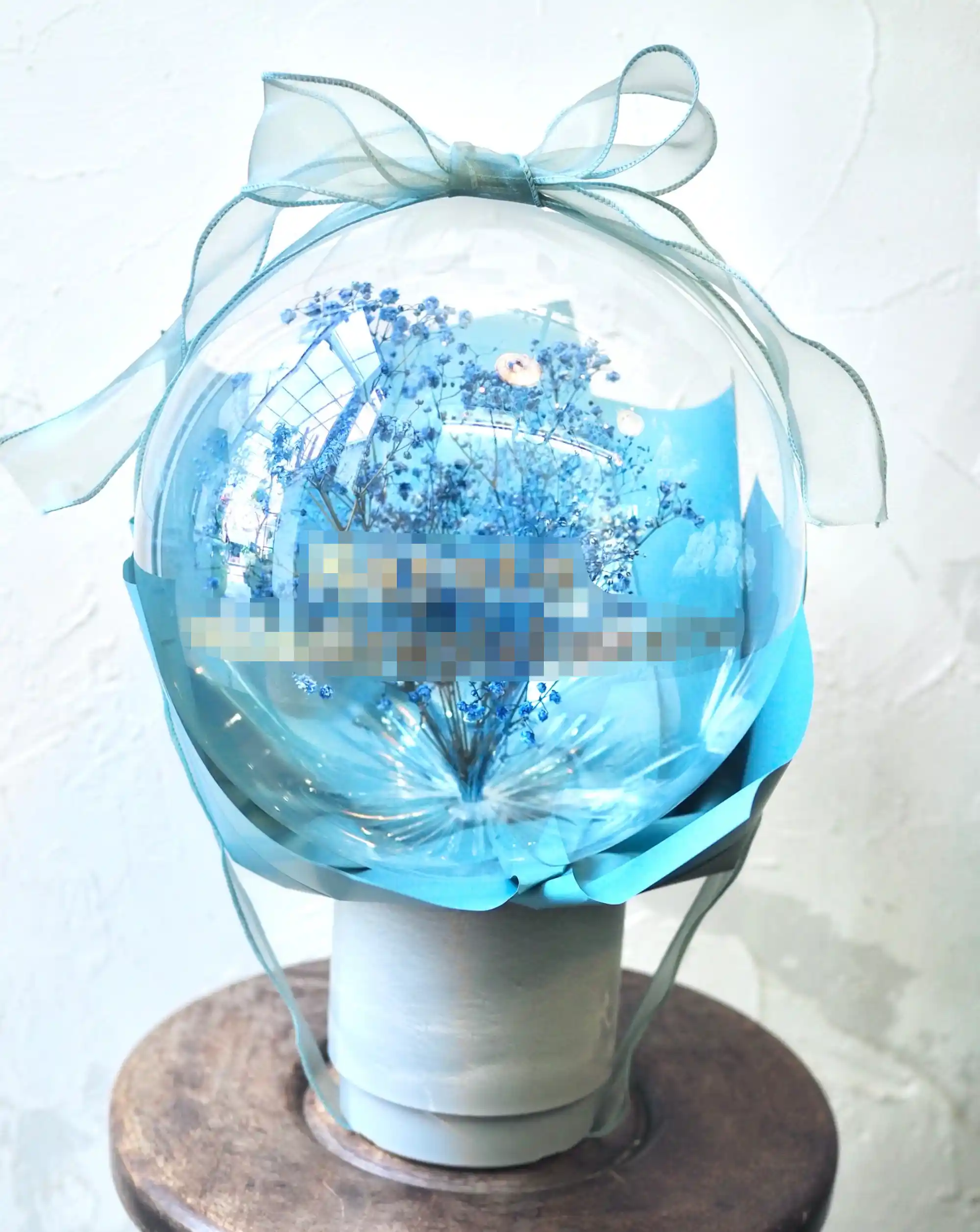 ブルーに染めたドライのかすみ草をバルーンに詰め込んで、可愛くラッピングしてお届けします。バルーンには推しのお名前や公演タイトル、応援メッセージなどの文字入れが可能です。推し活シーンにぴったりの世界にひとつだけのフラワーギフトに。ライブ・舞台・イベントなど、大切な推しの晴れ舞台を華やかに彩る公演祝いとしておすすめです。