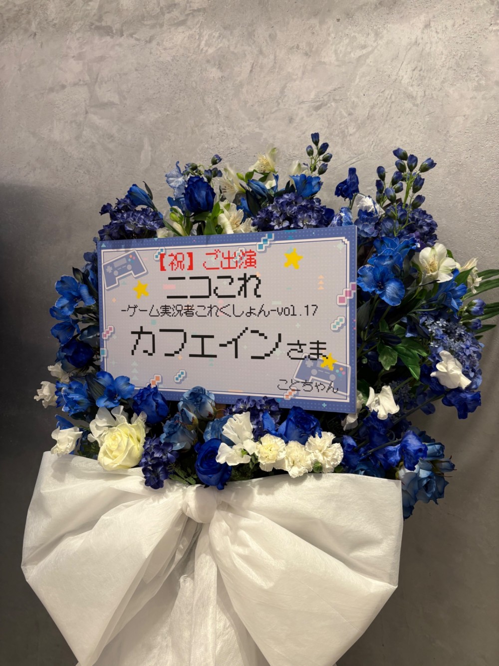 ブルーを基調に華やかにおつくりしたご出演祝い花・楽屋花