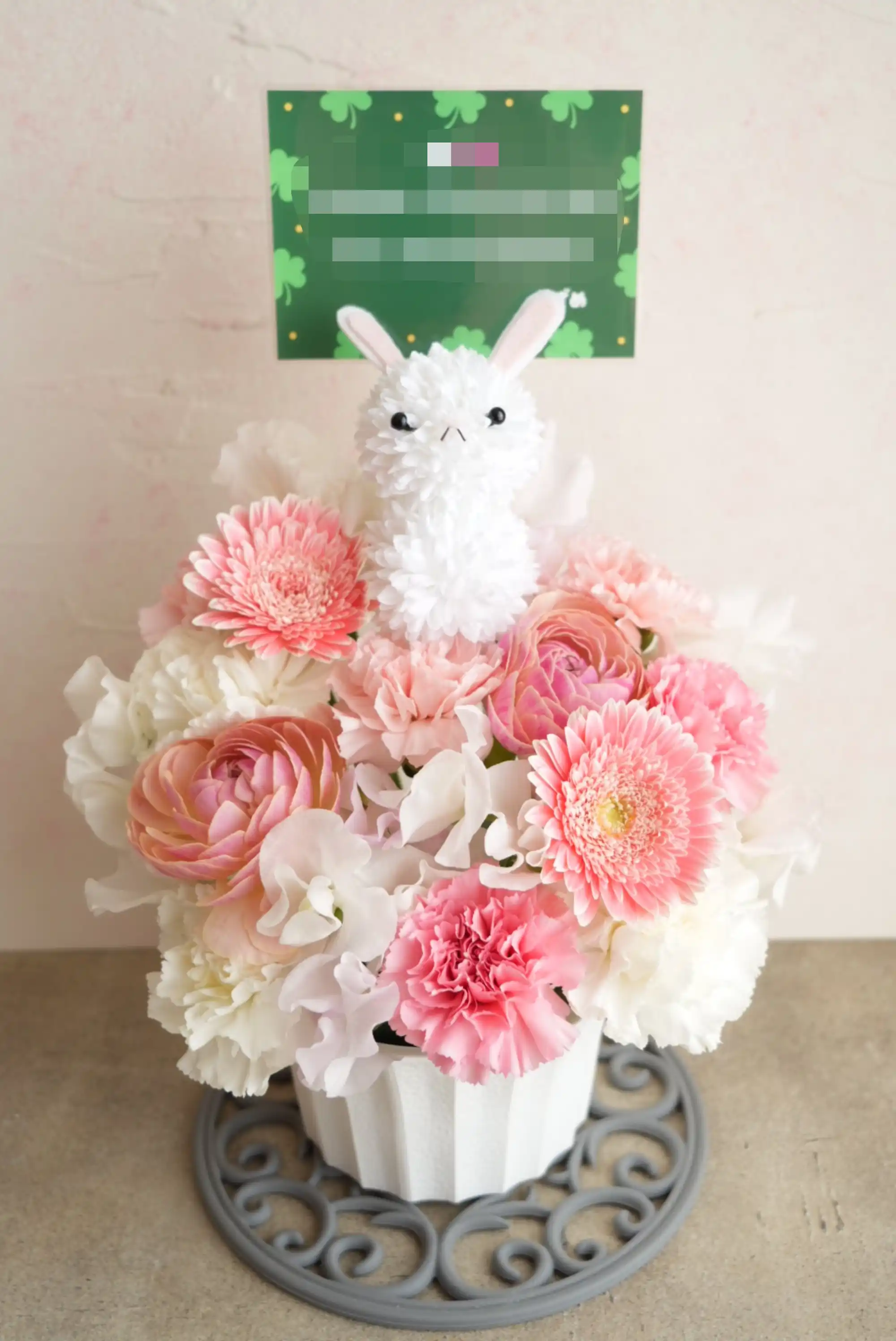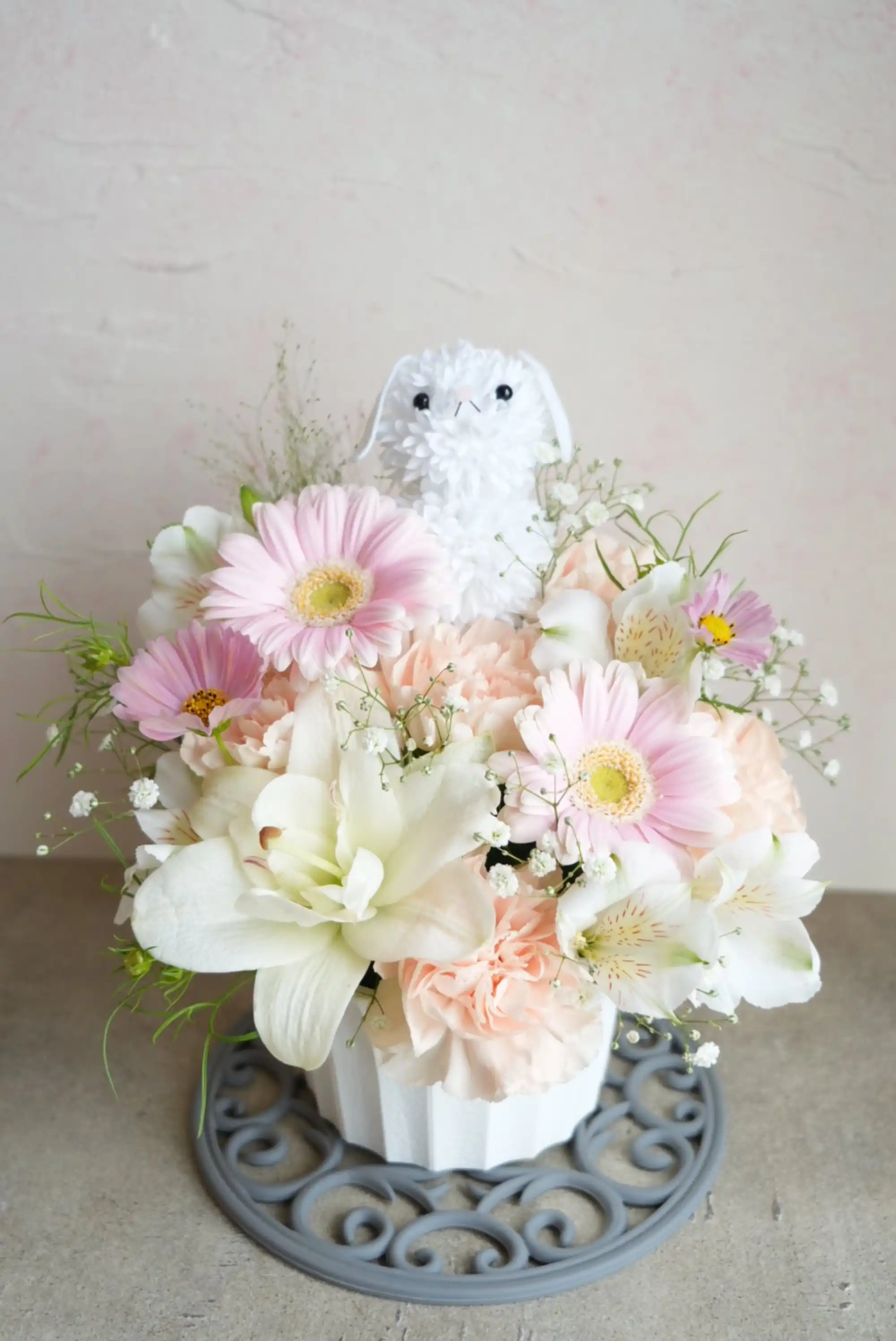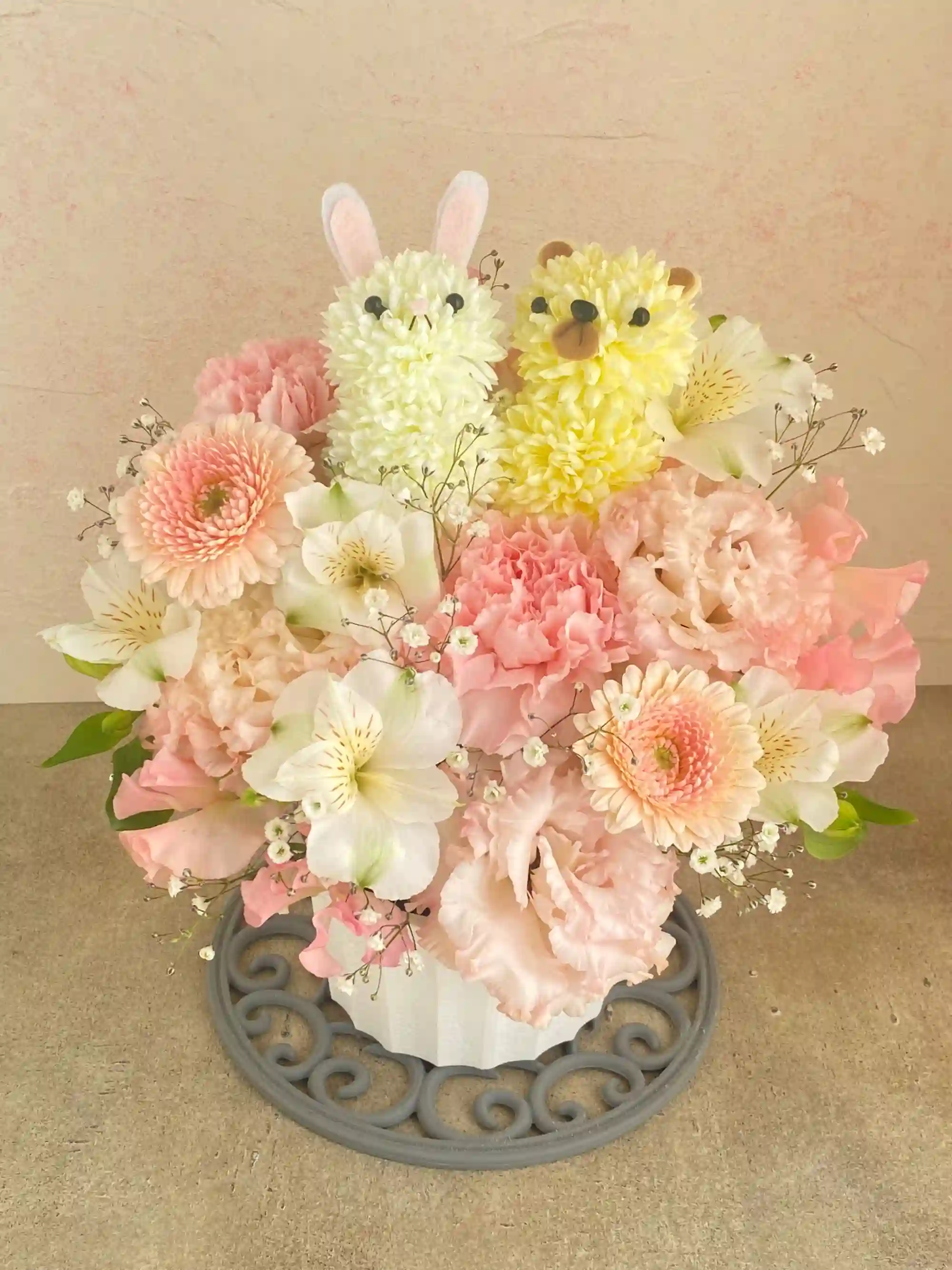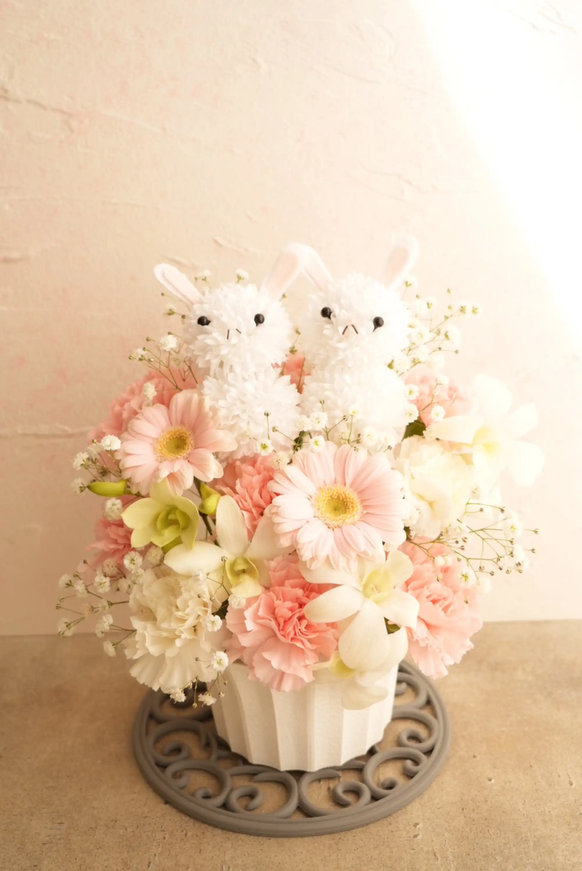 可愛らしいうさぎさんのフラワーアレンジです。どうぶつは1個+1,500円で追加可能。お誕生日やお祝いはもちろん、推し活や公演花にもぴったり。可愛らしさと癒しをお届けする、特別なアレンジです。※どうぶつ部分のみ造花でお作りしております。(どうぶつサイズ 横6×縦10×奥行7cm)