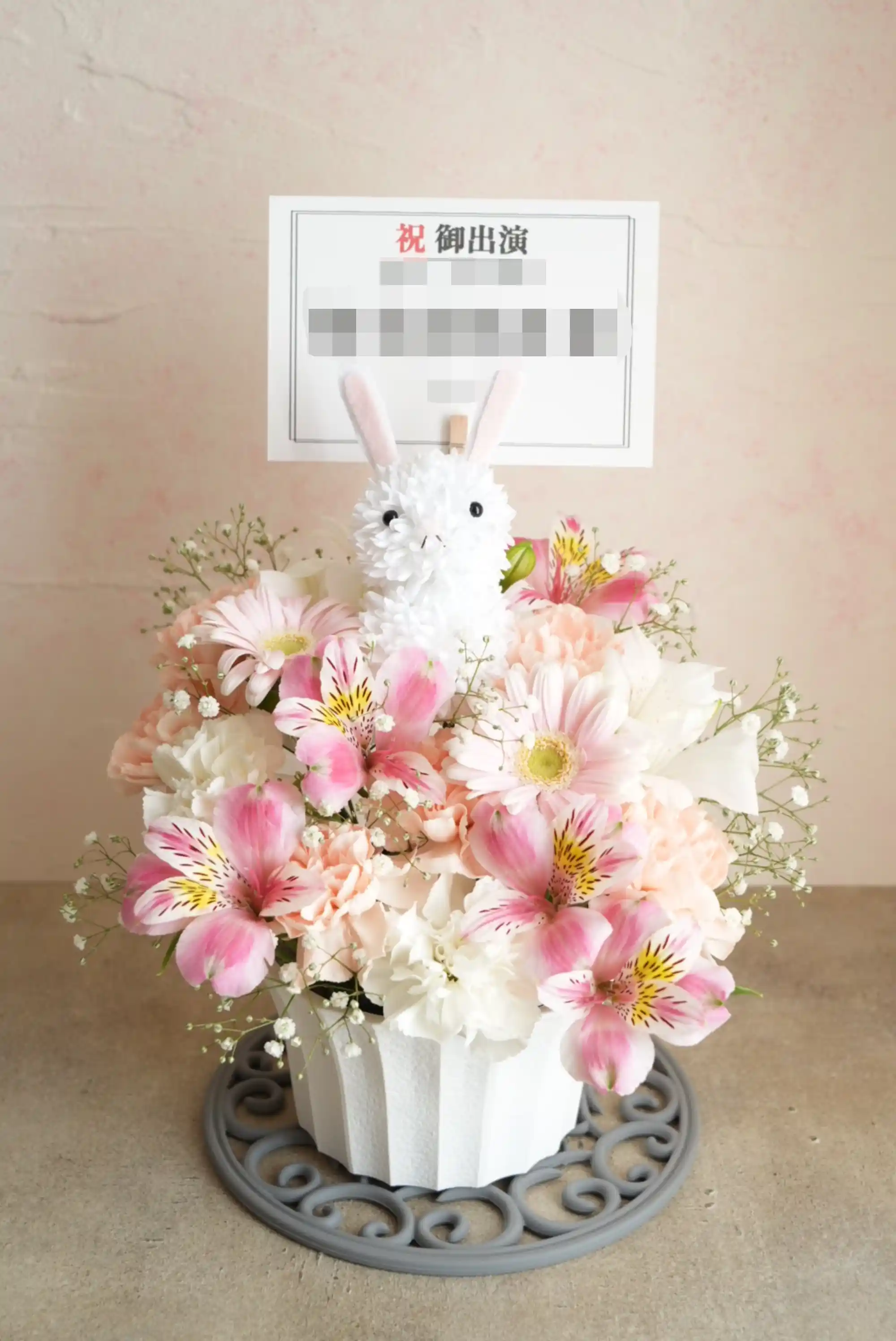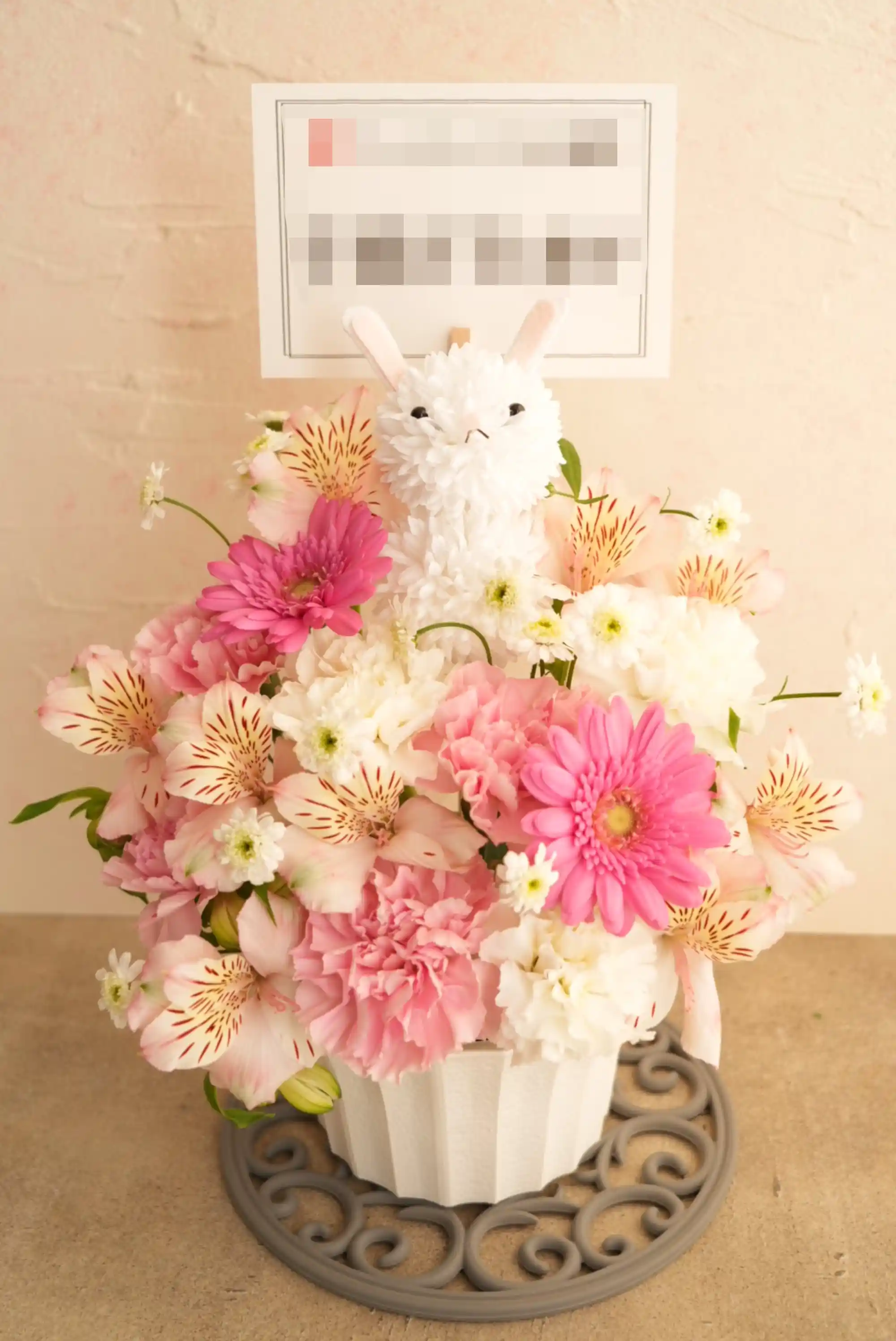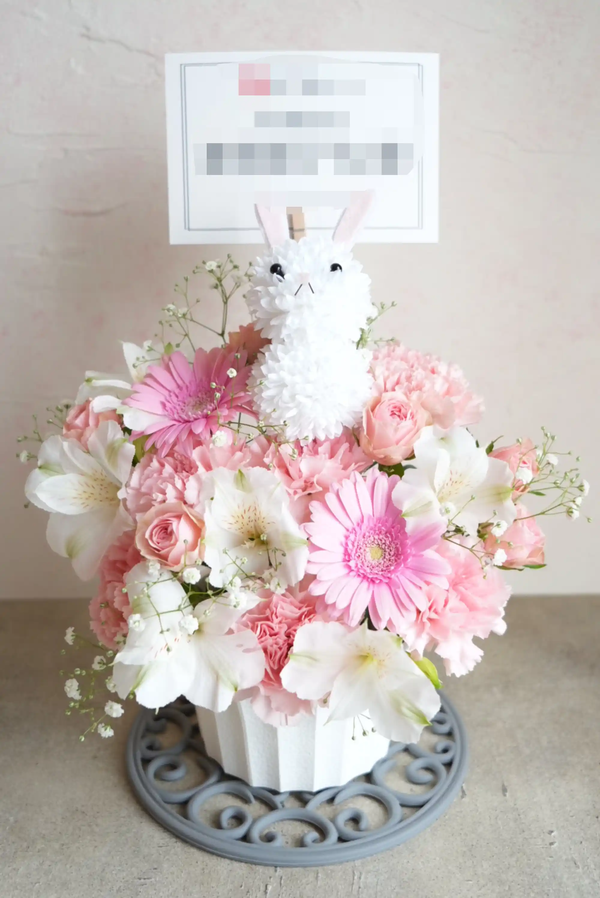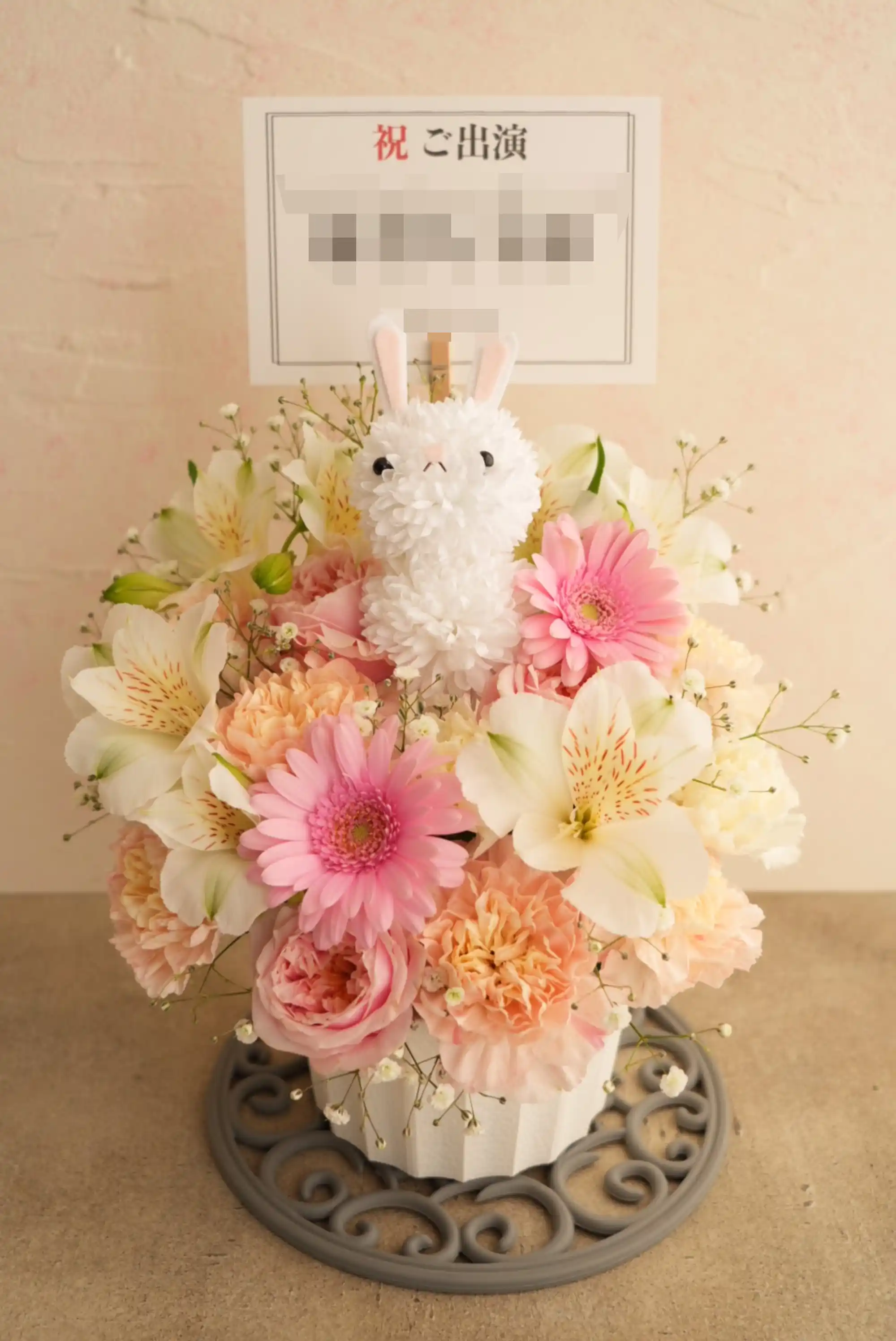 可愛らしいうさぎさんのフラワーアレンジです。どうぶつは1個+1,500円で追加可能。お誕生日やお祝いはもちろん、推し活や公演花にもぴったり。可愛らしさと癒しをお届けする、特別なアレンジです。※どうぶつ部分のみ造花でお作りしております。(どうぶつサイズ 横6×縦10×奥行7cm)