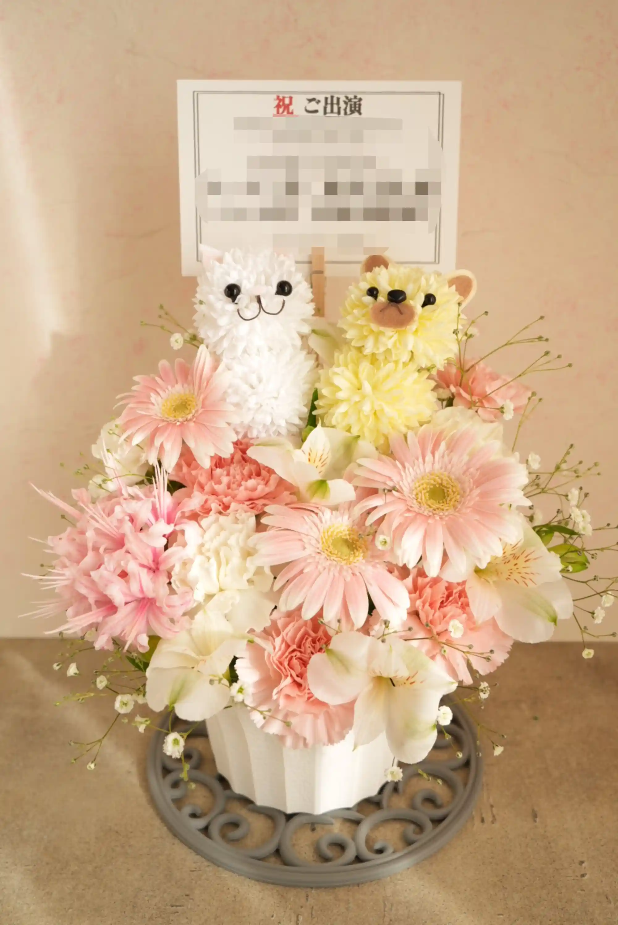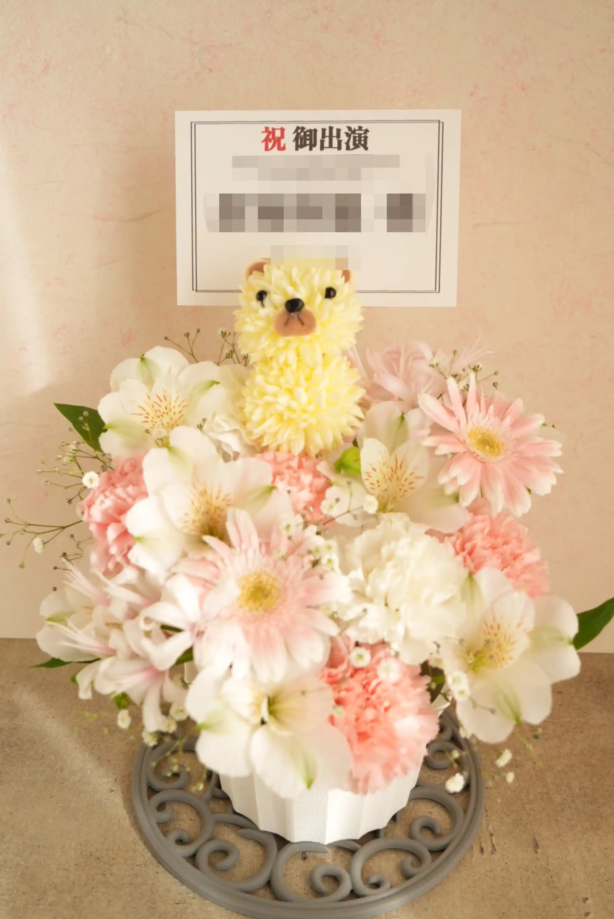 可愛らしいくまさんのフラワーアレンジです。どうぶつは1個+1,000円で追加可能。お誕生日やお祝いはもちろん、推し活や公演花にもぴったり。可愛らしさと癒しをお届けする、特別なアレンジです。※どうぶつ部分のみ造花でお作りしております。(どうぶつサイズ 横6×縦10×奥行7cm)