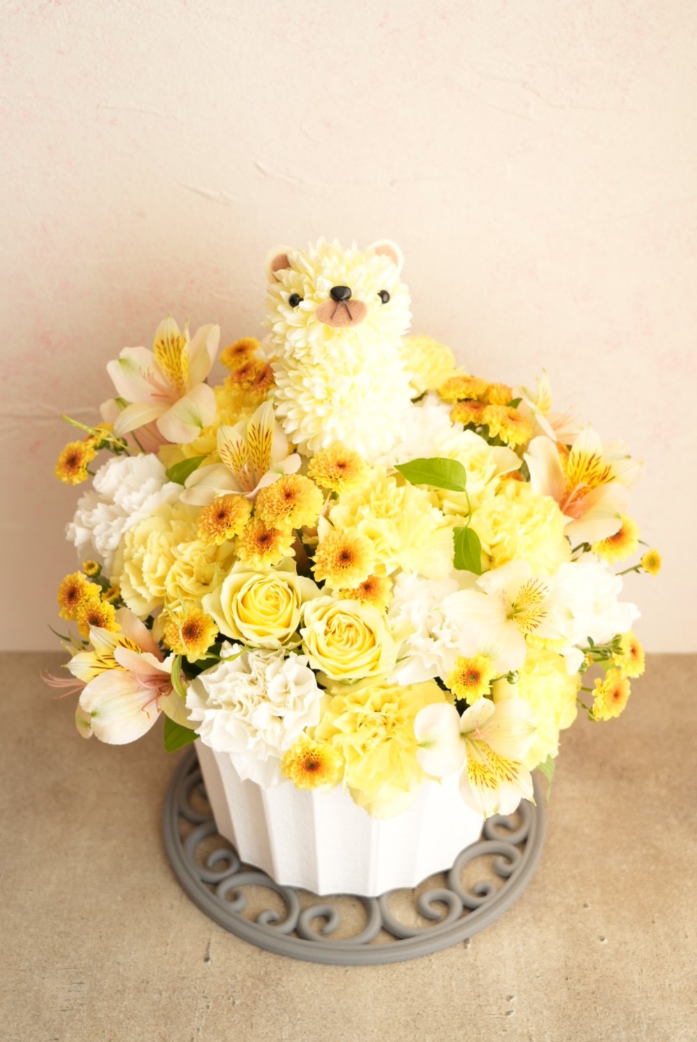 可愛らしいくまさんのフラワーアレンジです。どうぶつは1個+1,500円で4個まで追加可能。お誕生日やお祝いはもちろん、推し活や公演花にもぴったり。可愛らしさと癒しをお届けする、特別なアレンジです。※どうぶつ部分のみ造花でお作りしております。(どうぶつサイズ 横6×縦10×奥行7cm)