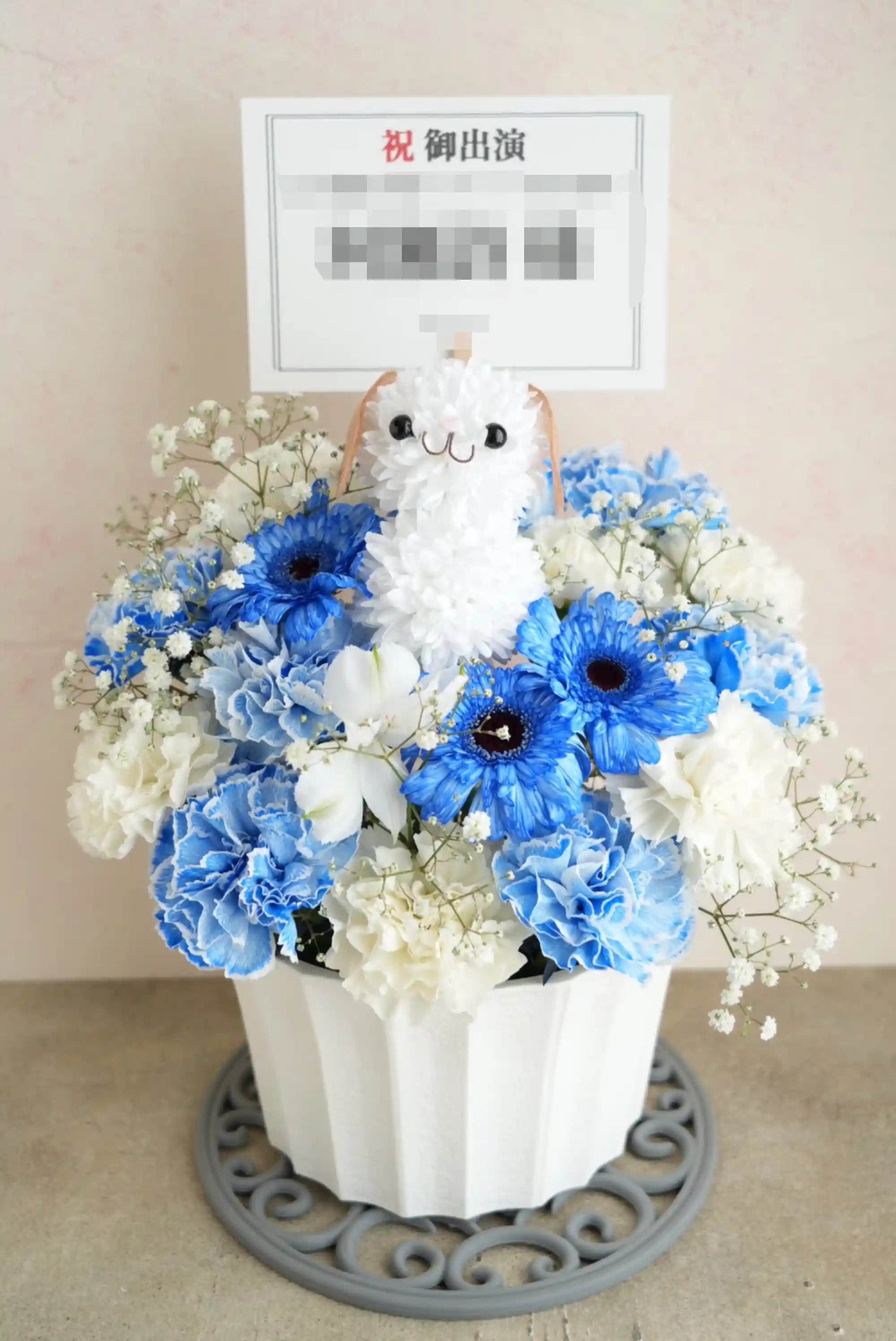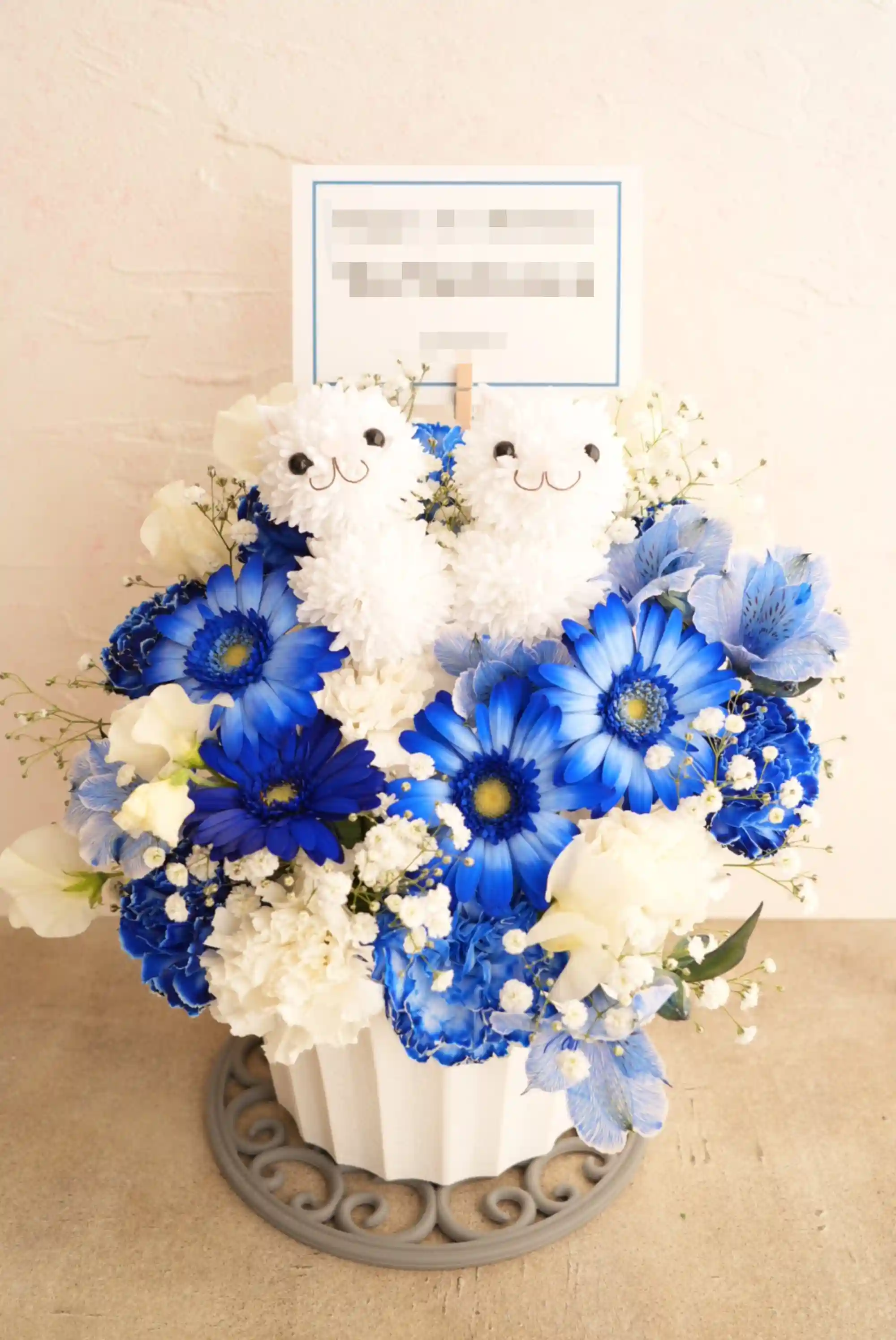 生花のリボンバスケットアレンジ 白ブルー