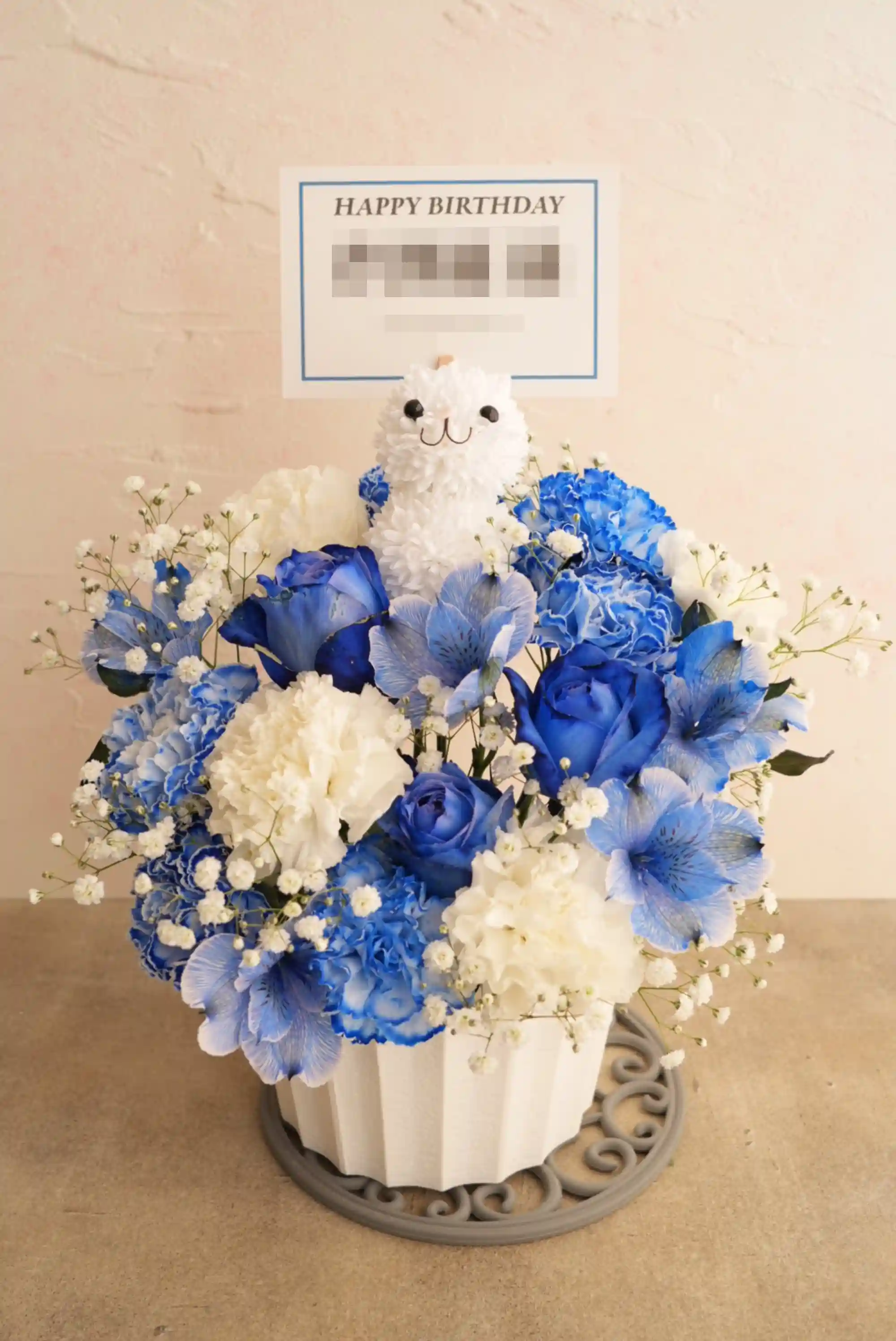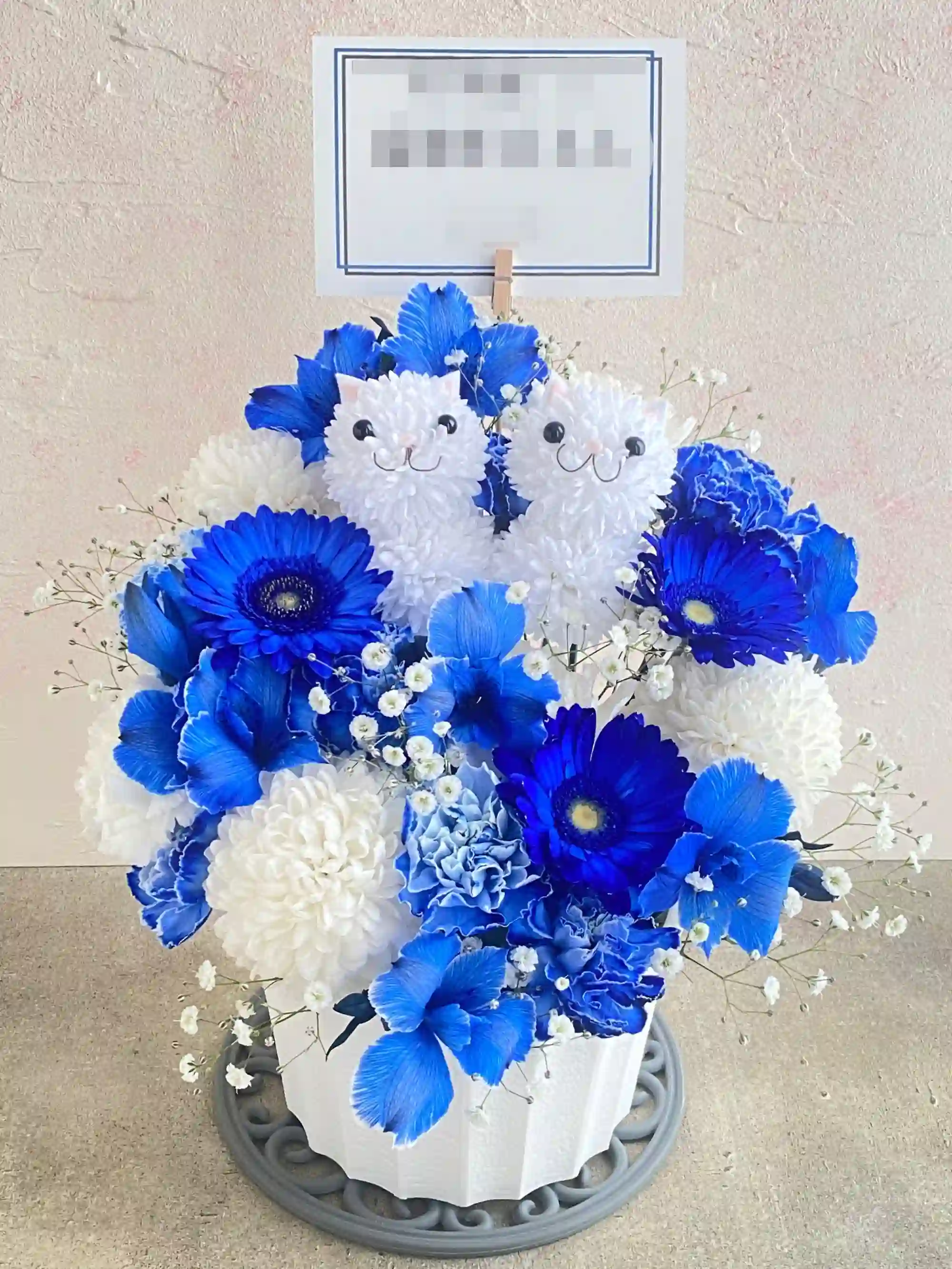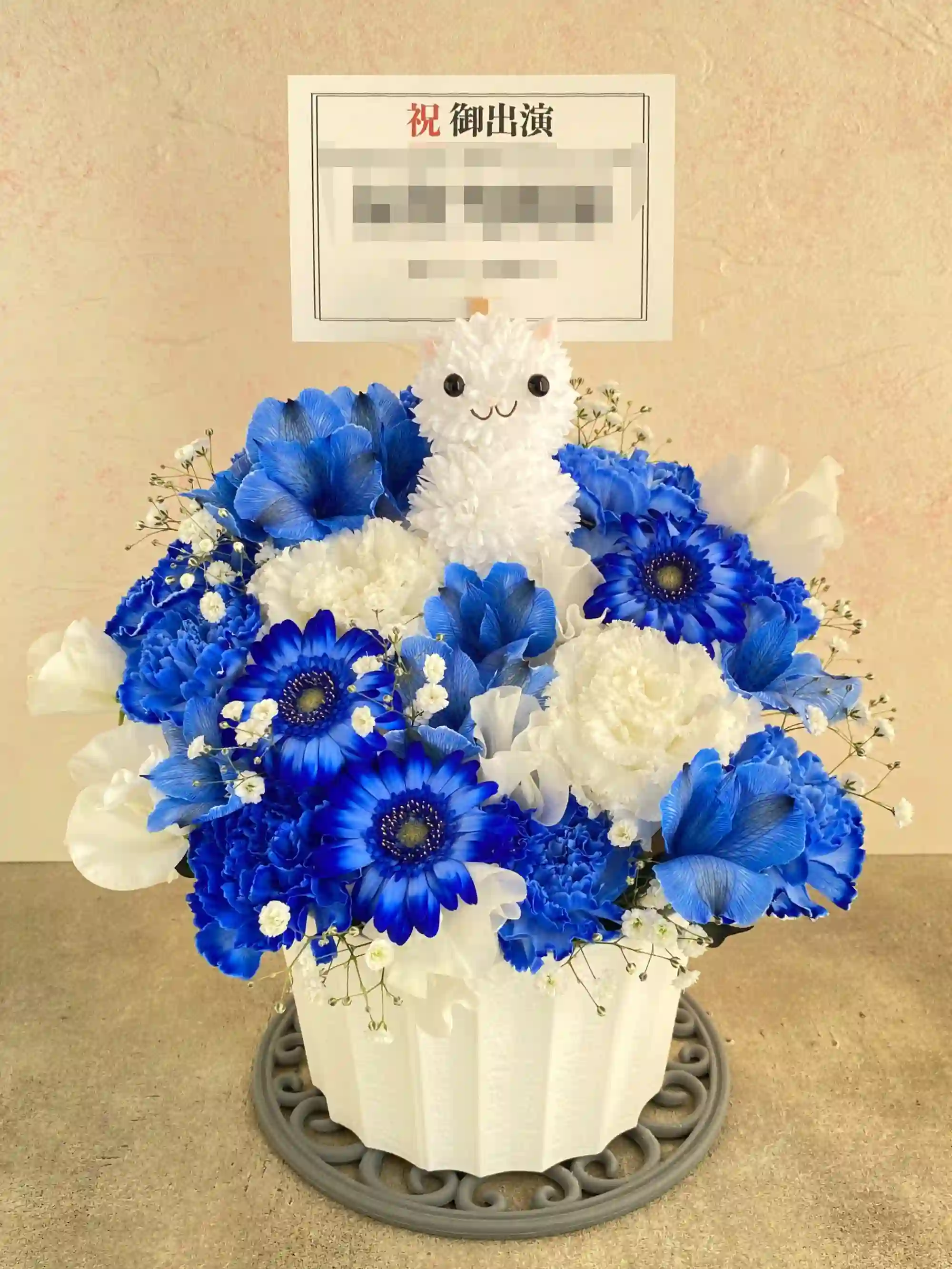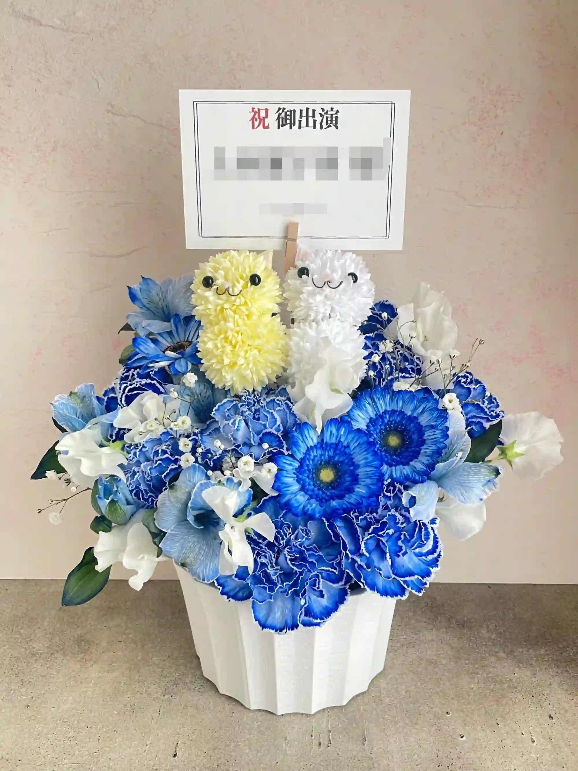可愛らしいねこさんのフラワーアレンジです。どうぶつは1個+1,500円で4個まで追加可能。お誕生日やお祝いはもちろん、推し活や公演花にもぴったり。可愛らしさと癒しをお届けする、特別なアレンジです。※どうぶつ部分のみ造花でお作りしております。(どうぶつサイズ 横6×縦10×奥行7cm)