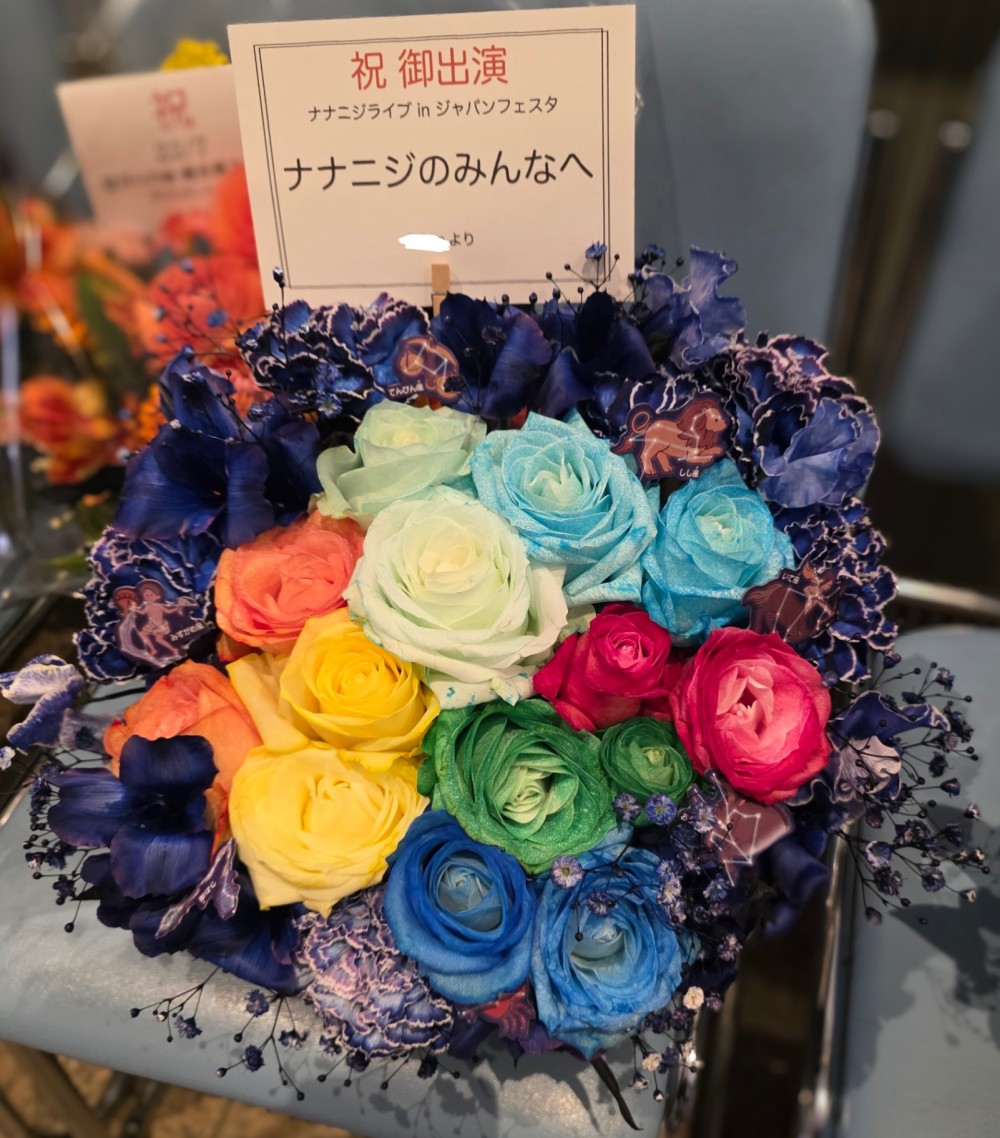 ハートの形、衣装の色味を取り入れたお花、事前にお送りしていたデザイン画を再現した楽屋花が完成し感動しました。今回実物を見る事が叶わなかった為、使用したお花の種類もチャットに記載して頂き嬉しかったです。初めての依頼にも丁寧に相談に乗って頂きありがとうございました。また機会があれば是非依頼したいです!