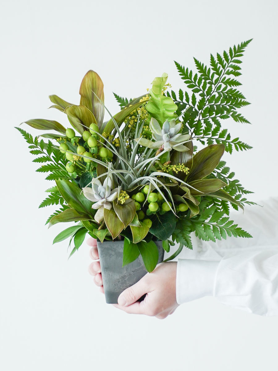 グリーン一色でシンプルなのに、遊びがあって、コンパクトなサイズ感。男性にも喜んでいただけそうなデザインで、こちらも大人気でした!アレンジメントが朽ちる時期になっても、エアプランツは適度に霧吹きをかける等で水やりをすれば長く楽しめ、2度楽しいアレンジメントになっています。