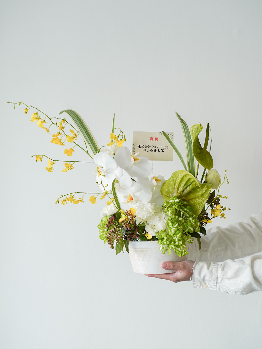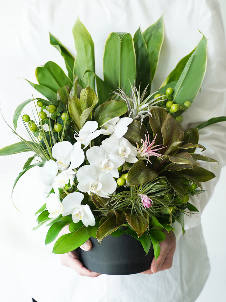 フラワーデザイナーOhataらしい、インパクトのあるアレンジ。胡蝶蘭にエアプランツを合わせたデザインなんて、Sakaseruにしかないのではないでしょうか…。クール、スタイリッシュ、個性的。そんな言葉が似合う方へのお届けにおすすめです。