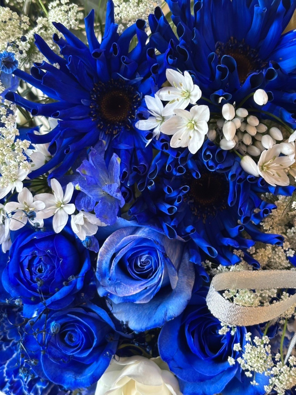 ダウトというバンドのギターの威吹さんのバースデーライブに作ってもらったものです。威吹さんはメンバーカラーが青で、水色とかよりは深めの青のイメージでお願いして作っていただきました。威吹さんはギターが上手くて美しくてかっこよくて王子様みたいな人で、その通りのイメージでアレンジメント作っていただけてとても嬉しいです。