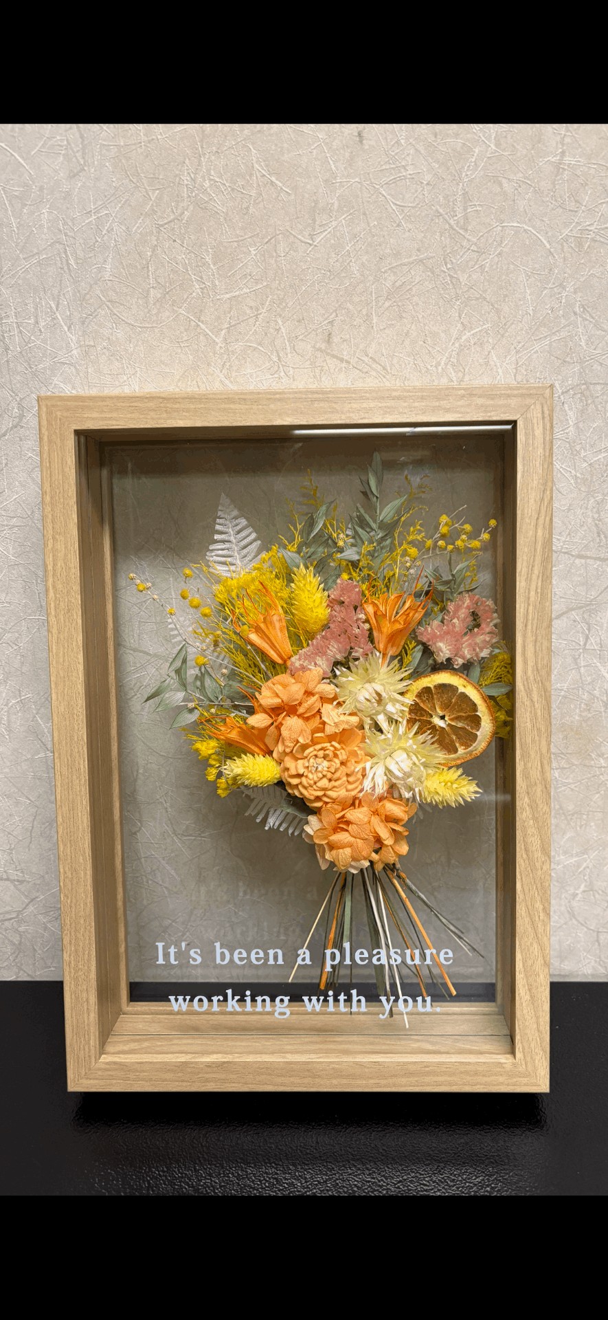 同僚の送別会まで日にちがない中で、数あるサイトから選ばせていただきました。注文から到着までスピーディーで、希望のイメージどおりの作品が届き、とても喜んでもらえました。メッセージにより感謝の気持ちを伝えられ、長く飾ることができて、自分がもらってもうれしい贈り物だと思いました。