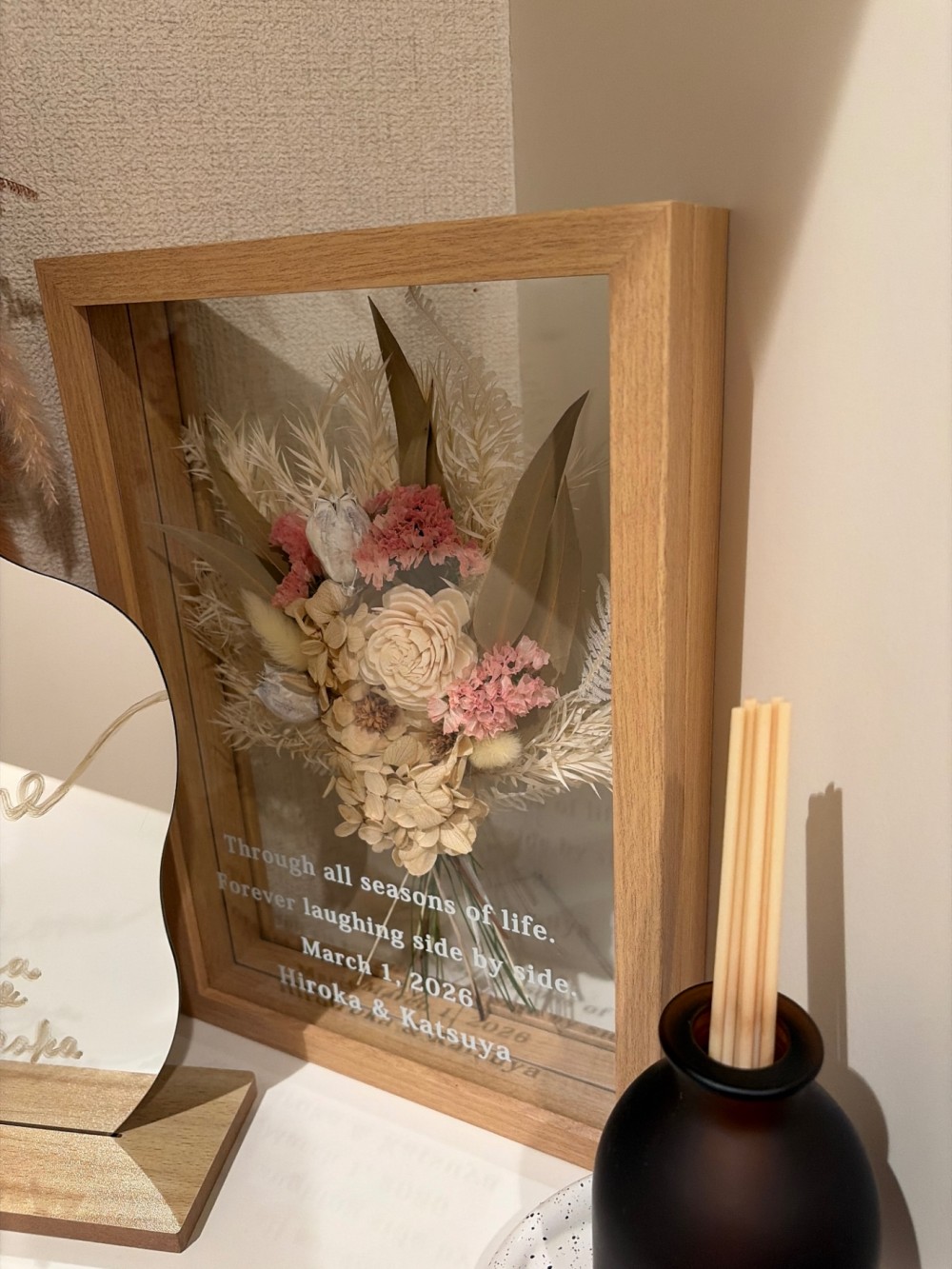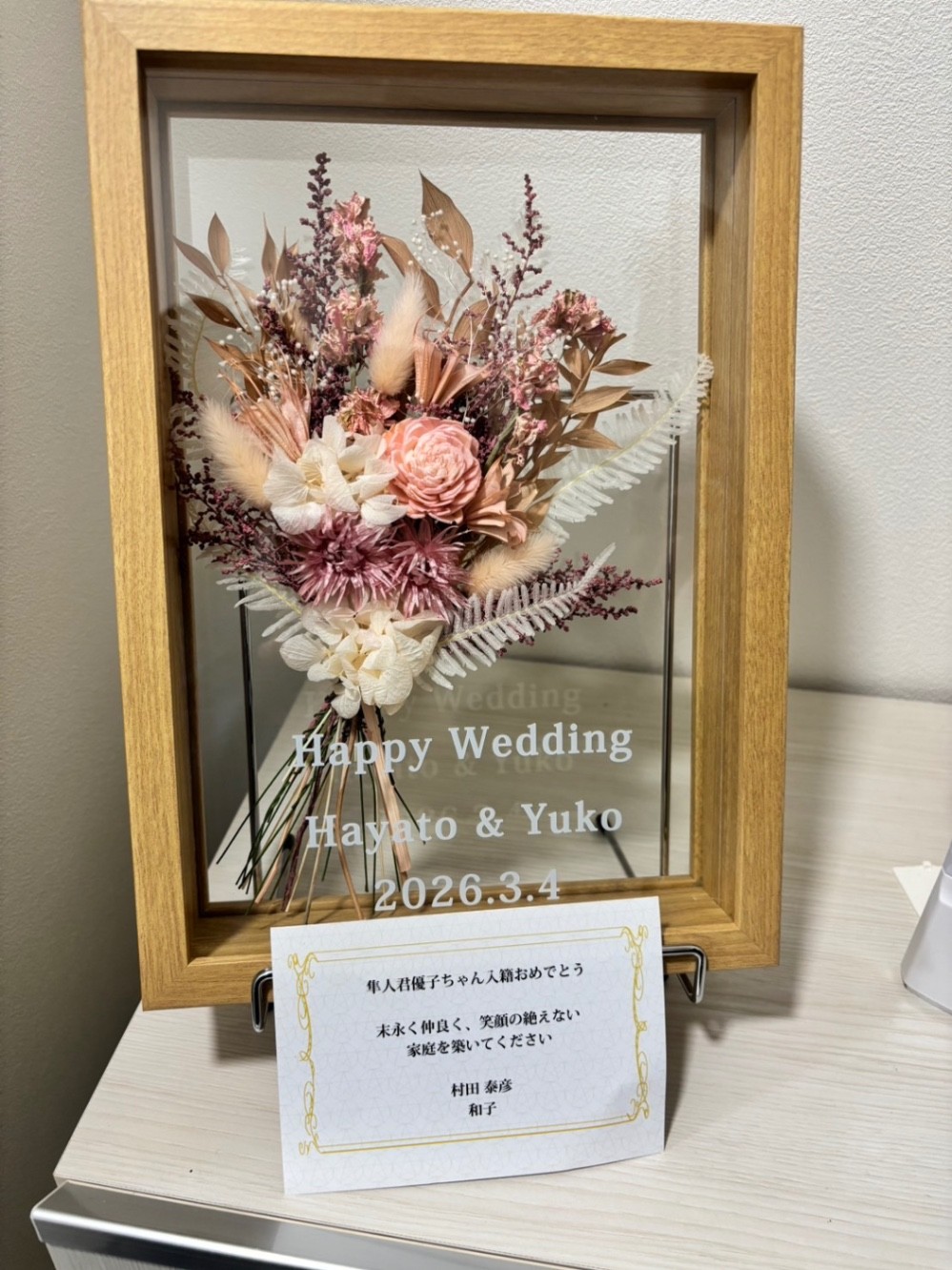 「素敵な演技への感謝と、新しい道が幸せであることを願って」衣装のお色味のフレーム入りドライフラワーのお祝い花