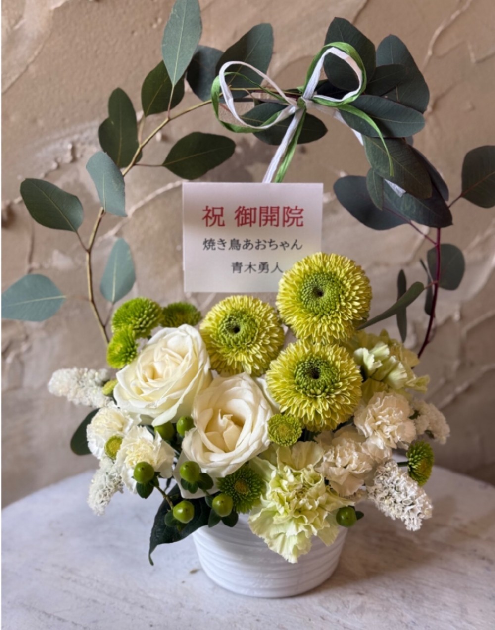 シミ取りケアサロンを開店する「chulasan」さまへお祝いでおつくりしたボリュームあるアレンジ花