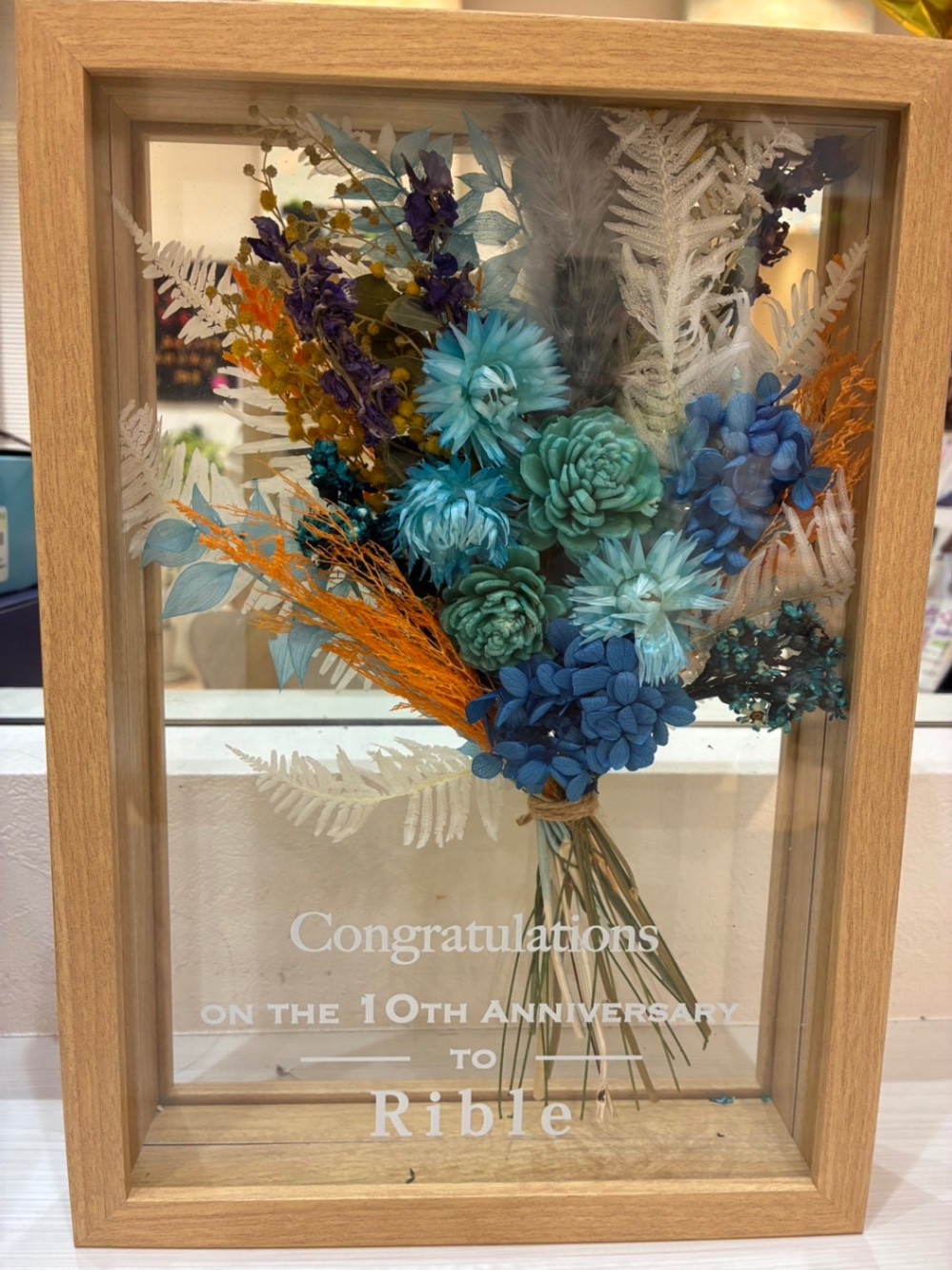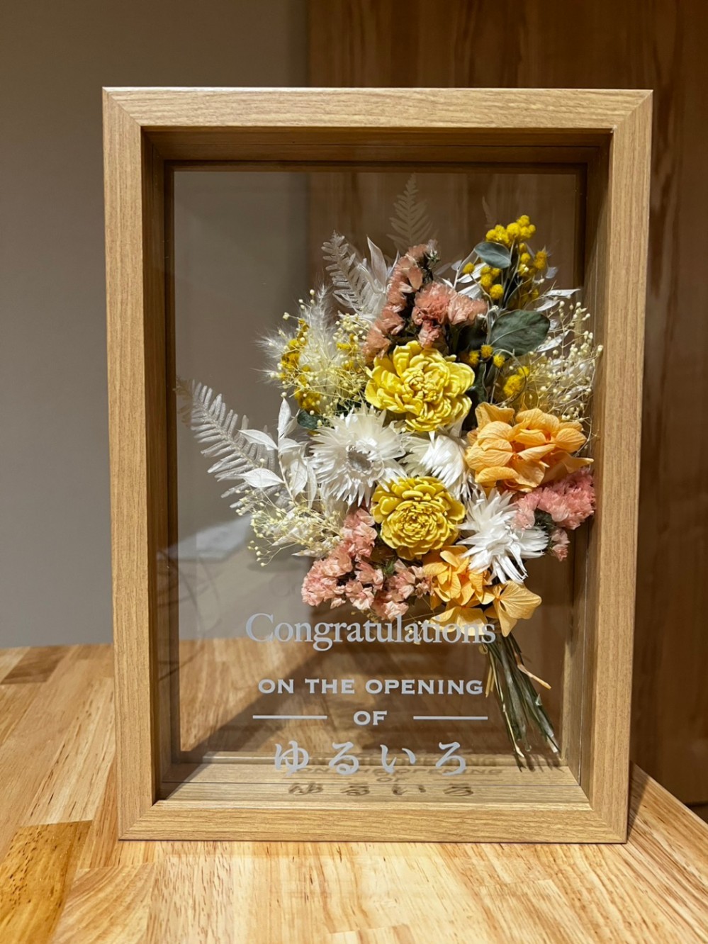輸送時に、フラワーの位置が箱の上の方にズレてしまい、フラワーの上のほうが圧迫されている形で届きました。箱を開けて位置を戻しましたが、圧迫された影響なのか、ドライフラワーの上にある花の粒がいくつか切り落ちていました。全体のデザインにはあまり影響しませんでしたが、箱の中である程度固定される仕掛があると良いと思いました。