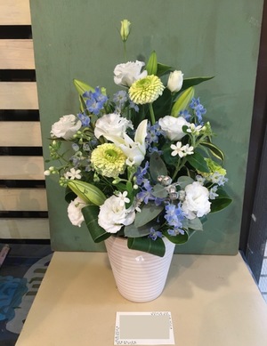 白とブルーの上品な誕生日フラワーギフト