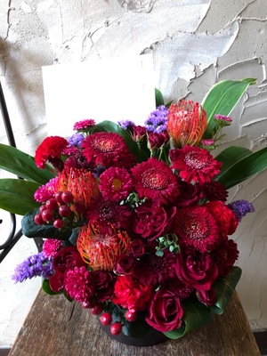 「お店の開店が華やかに、そして力強く繁盛していきますように」お店の雰囲気をイメージした開店祝い花