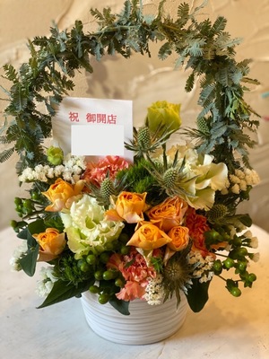 「男性の方にも喜んで頂けるように」アーチが印象的な開店祝い花