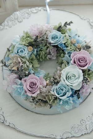 「ブルーが好きなお母様へ」お母様が好きなイングリッシュガーデンのような華やかさあふれるブルーを基調としたリースのアレンジメント