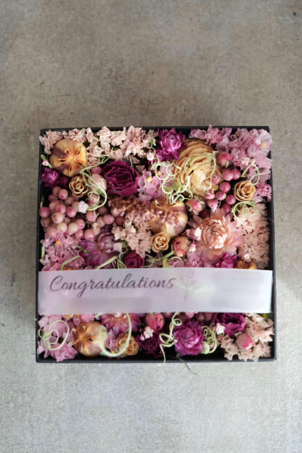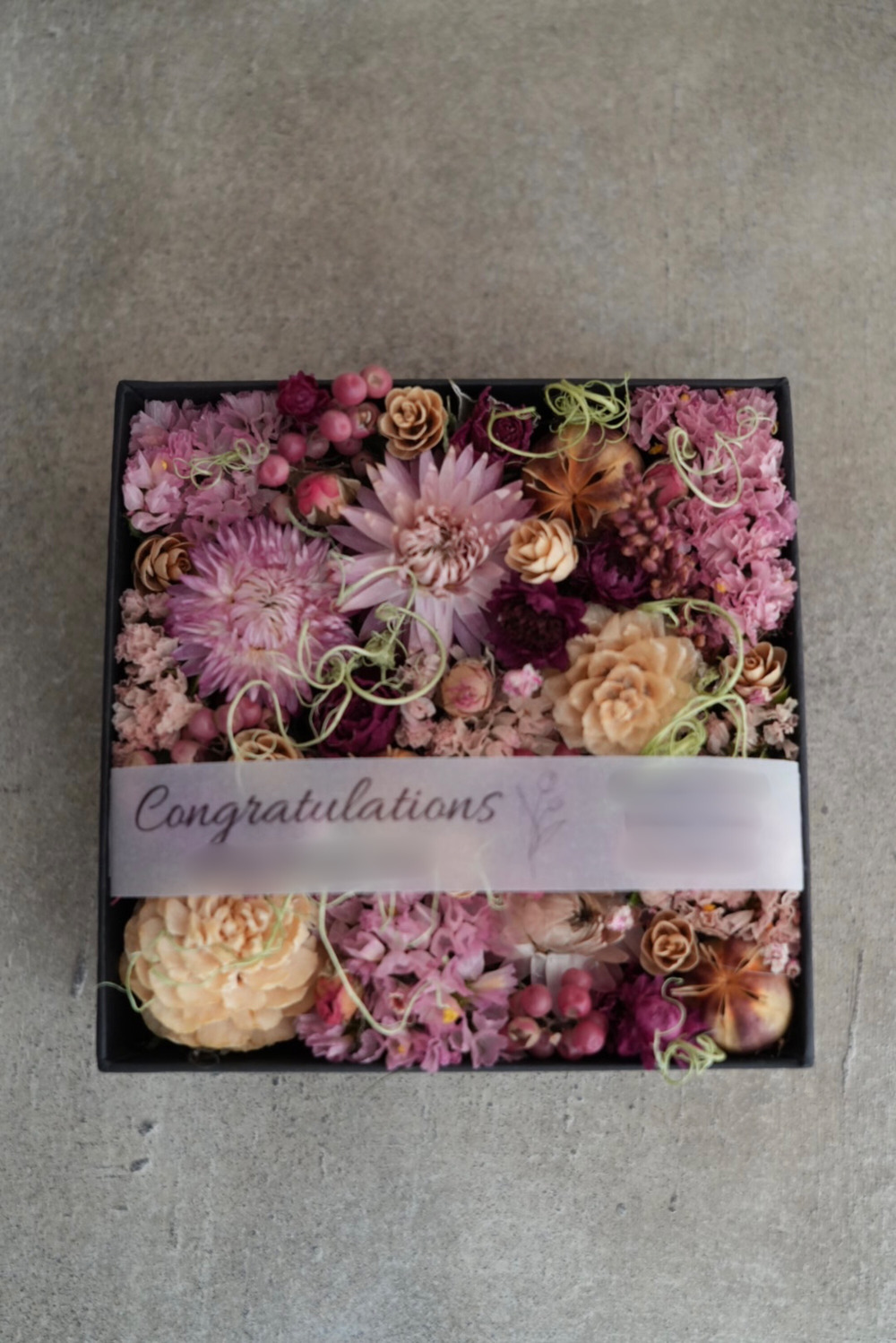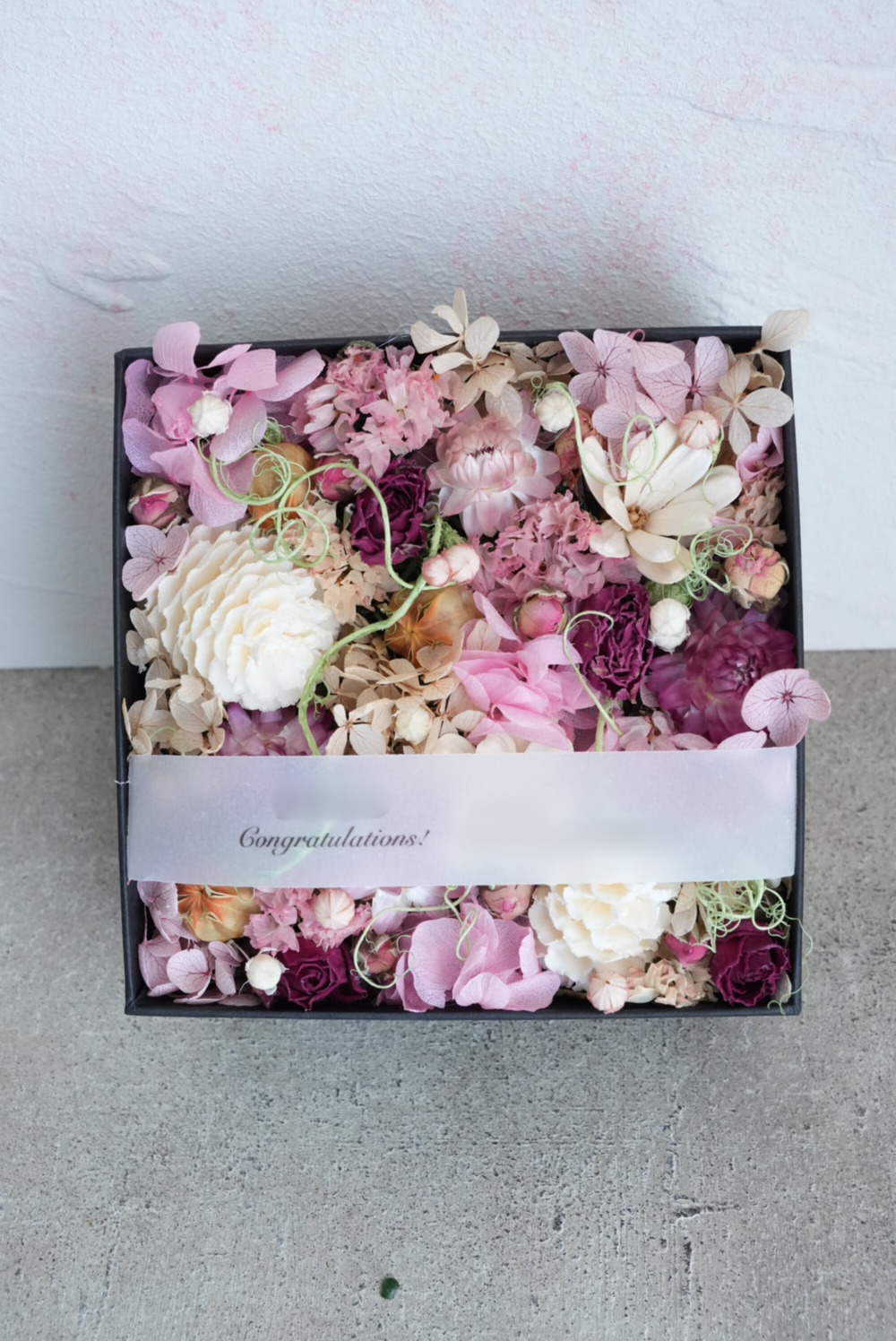 ボックスの中にたくさんのドライフラワーを詰め込んで、お名前や日付をお入れした帯をかけてお届けいたします。宝石箱を開けた時のような喜びはボックスフラワーならではの体験。ギフトから手土産まで、様々なシーンでおすすめのフラワーギフトです。