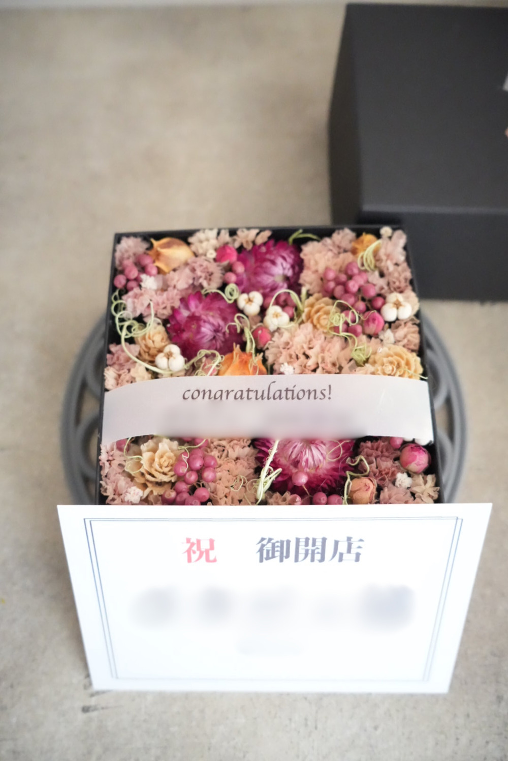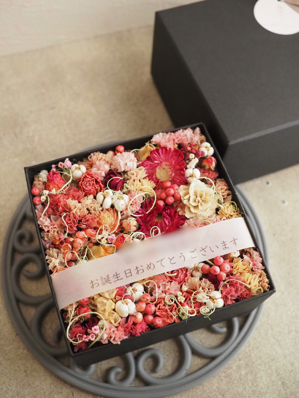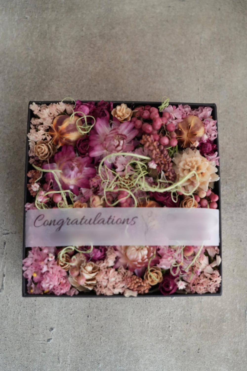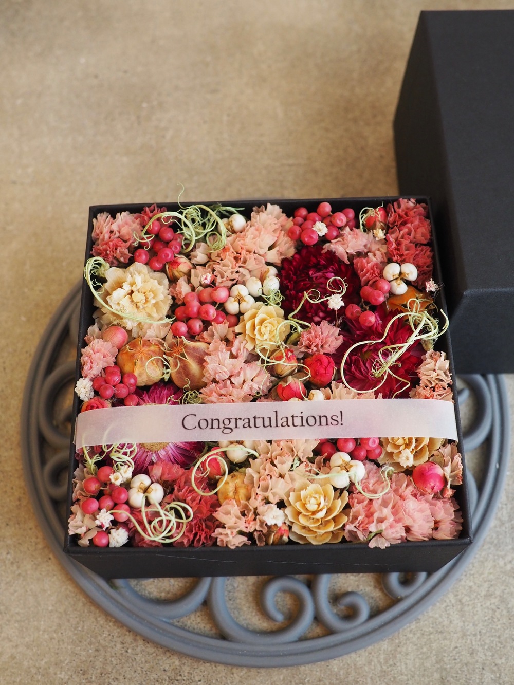 ボックスの中にたくさんのドライフラワーを詰め込んで、お名前や日付をお入れした帯をかけてお届けいたします。宝石箱を開けた時のような喜びはボックスフラワーならではの体験。ギフトから手土産まで、様々なシーンでおすすめのフラワーギフトです。