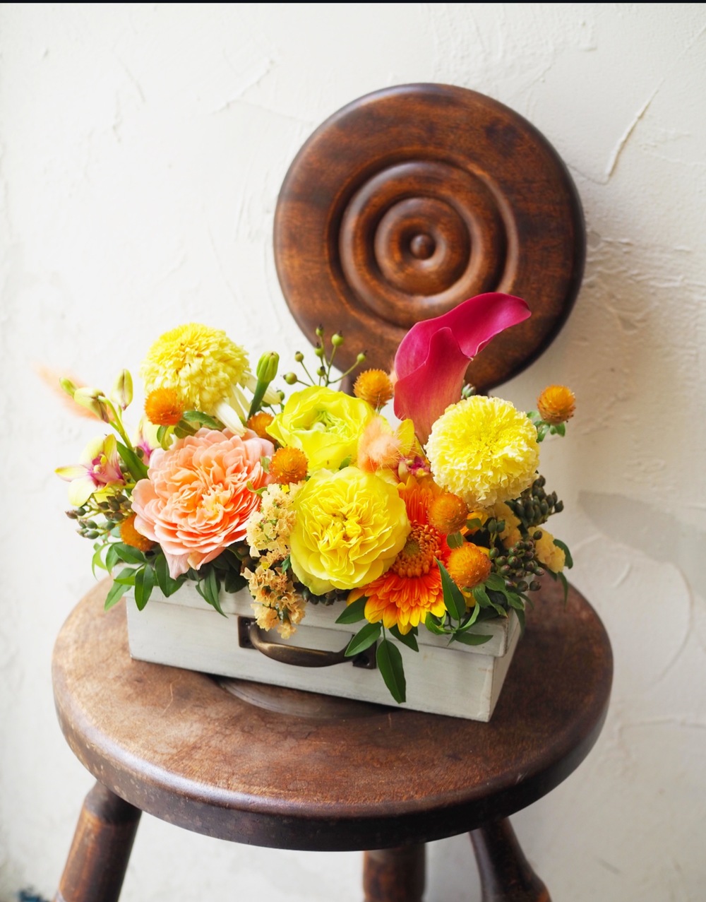 ウッドトランク生花アレンジ イエロー M