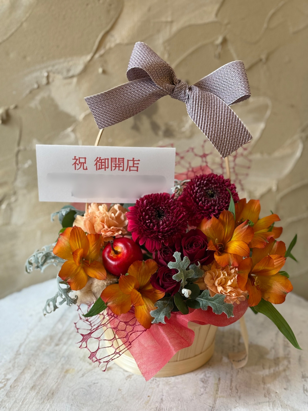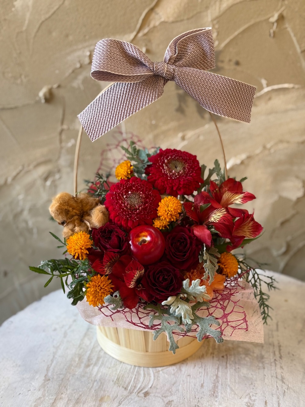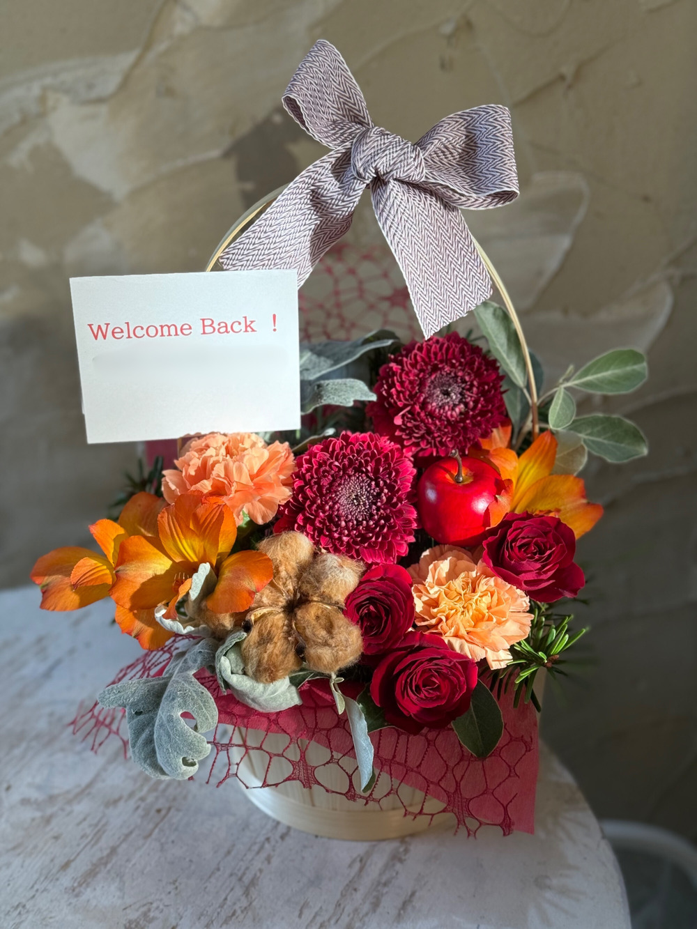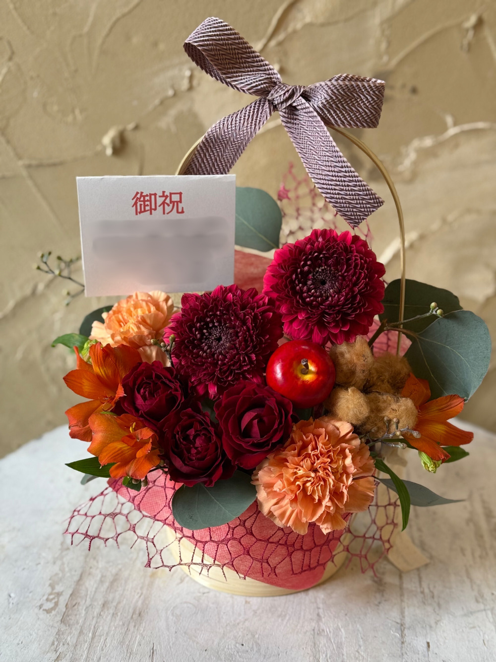 人気の八重咲ガーベラやバラをメインに、可愛らしいりんごやコットンを添えて、温かみのある色合いで冬らしく華やかにまとめました。ナチュラルカラーのリボンをあしらった手付きバンブーバスケットに、ころんとした可愛らしいフォルム。手に取るだけで心までほっと和むような、優しいアレンジです。※リボンの廃盤が決まってしまったため、ご注文のタイミングによっては色や太さが変更になる可能性がございます。※立て札をご自身でご用意いただく場合はハガキ半分のサイズでご用意をお願いします。