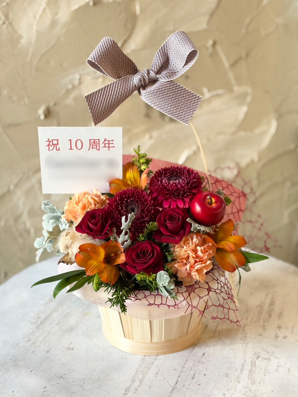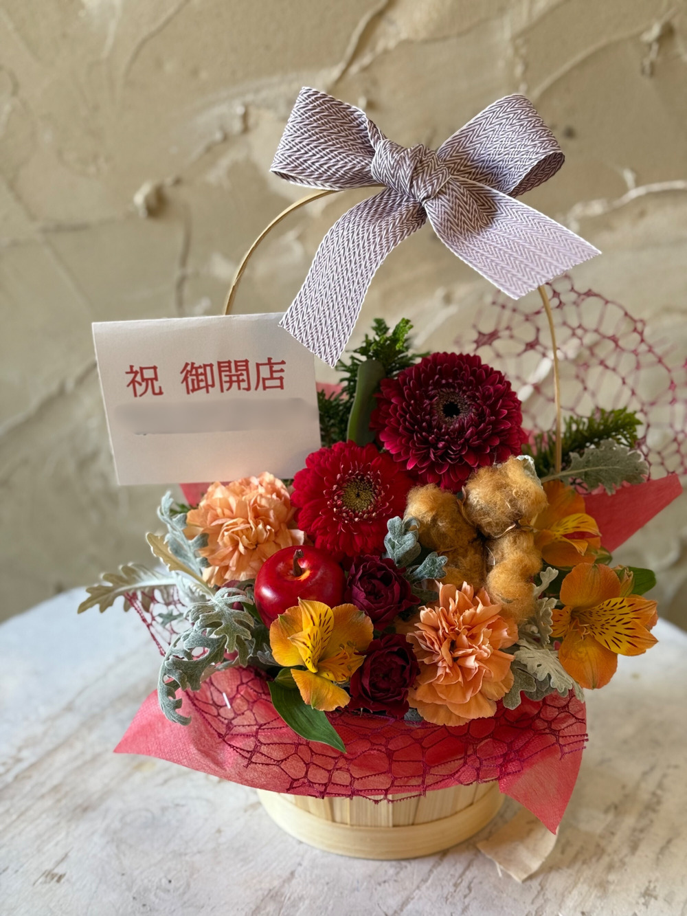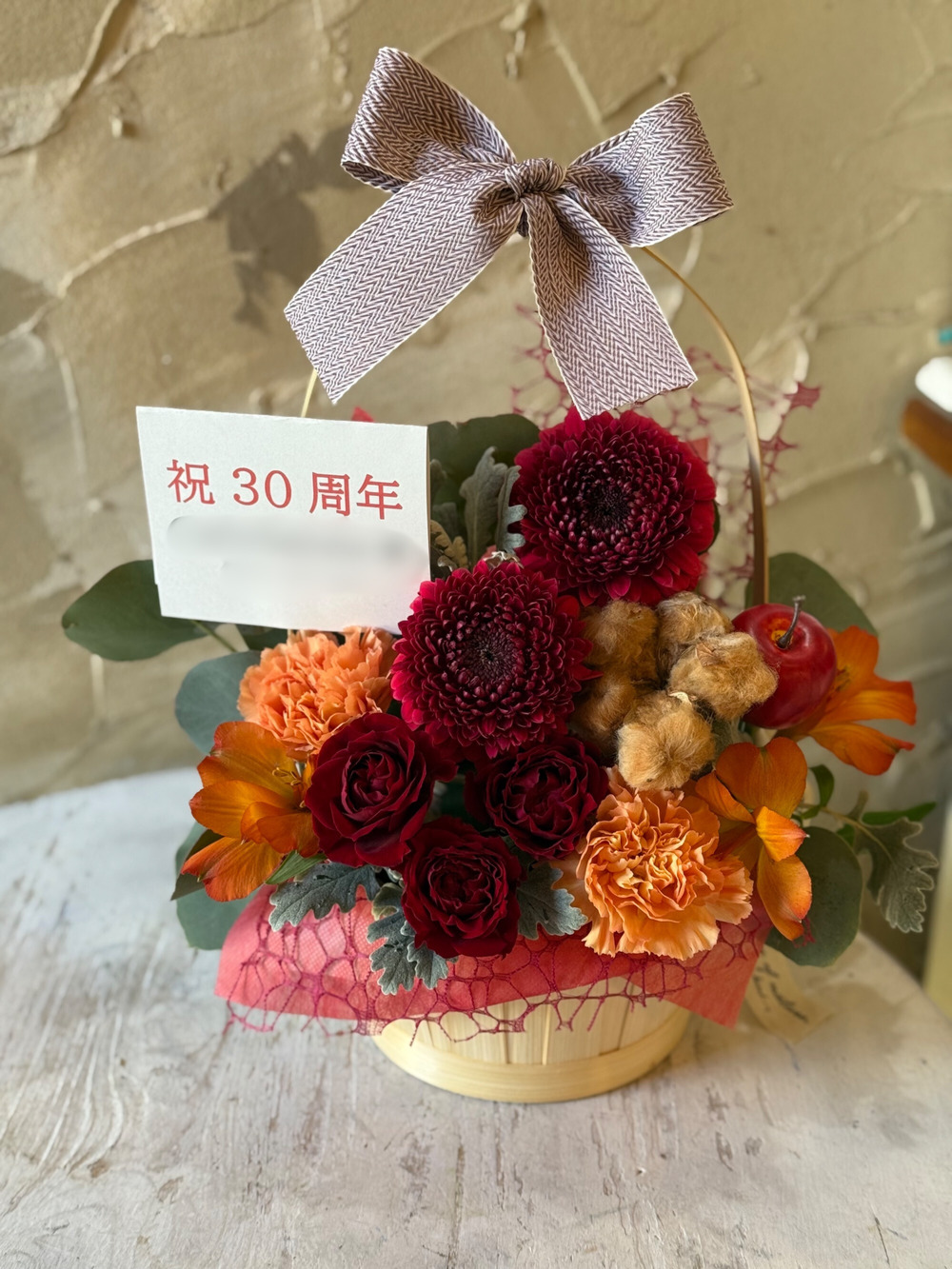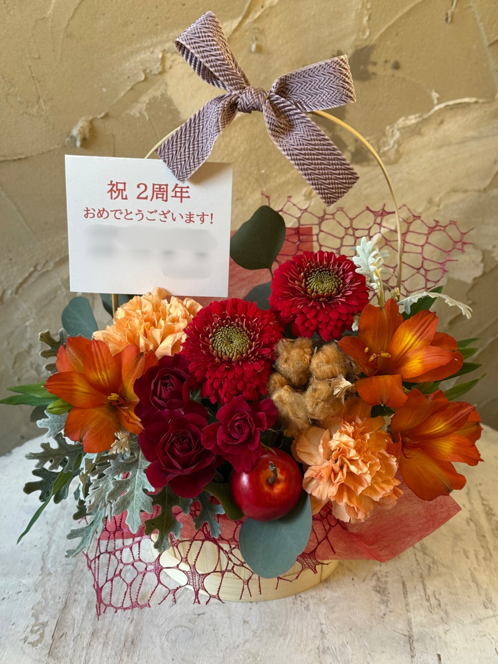 人気の八重咲ガーベラやバラをメインに、可愛らしいりんごやコットンを添えて、温かみのある色合いで冬らしく華やかにまとめました。ナチュラルカラーのリボンをあしらった手付きバンブーバスケットに、ころんとした可愛らしいフォルム。手に取るだけで心までほっと和むような、優しいアレンジです。※リボンの廃盤が決まってしまったため、ご注文のタイミングによっては色や太さが変更になる可能性がございます。※立て札をご自身でご用意いただく場合はハガキ半分のサイズでご用意をお願いします。